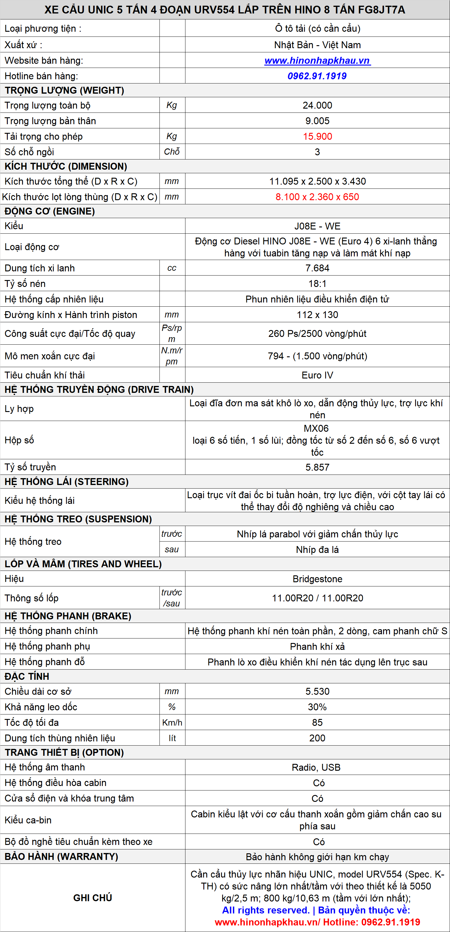 * THÔNG SỐ KỸ THUẬT XE TẢI CẨU UNIC 5 TẤN 4 ĐOẠN UR-V554K LẮP ĐẶT TRÊN XE TẢI HINO FG8JT7A ĐỜI 2021 - 2022: