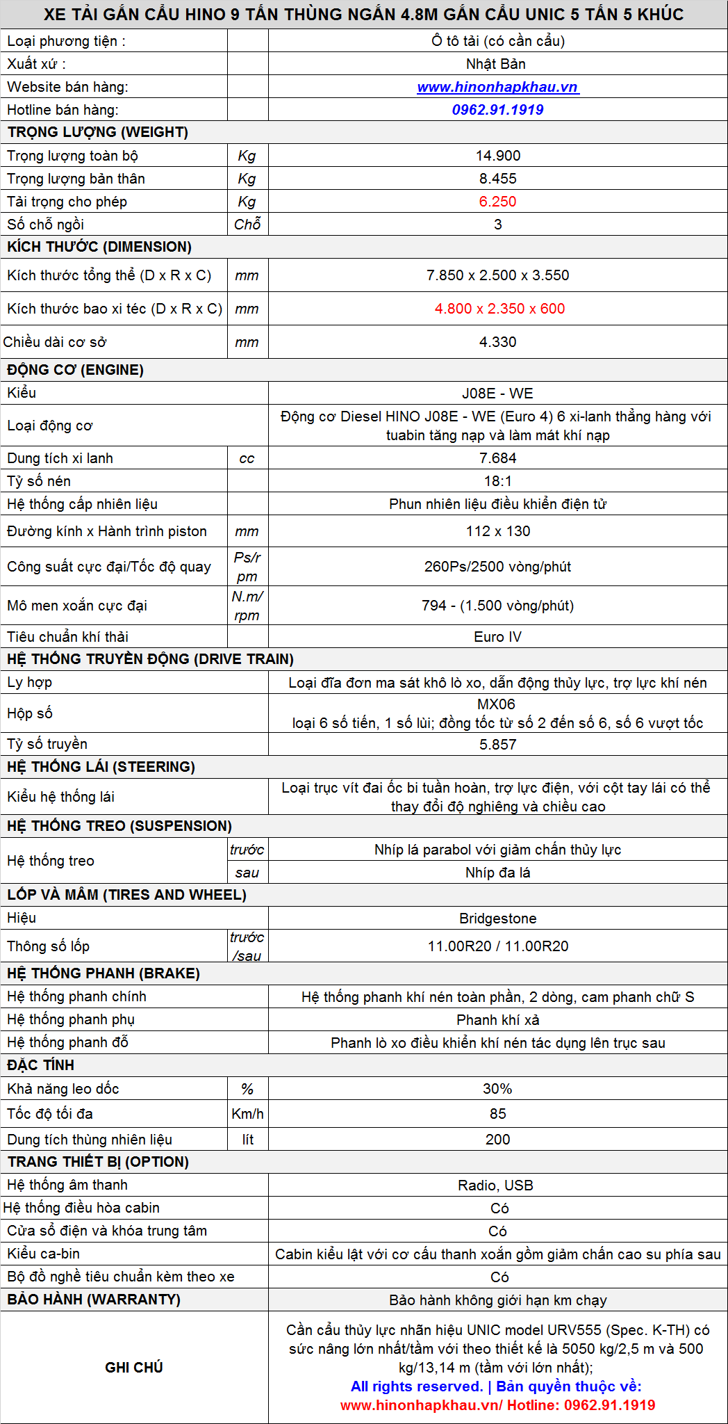 * THÔNG SỐ KỸ THUẬT XE CẨU TỰ HÀNH HINO 9 TẤN SẮT XI NGẮN LẮP CẨU UR-V555K NHẬP KHẨU :