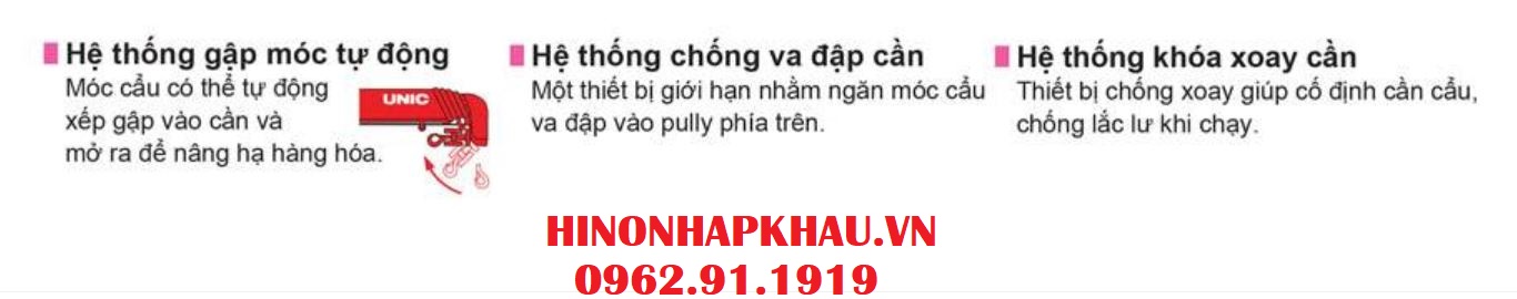 * ƯU ĐIỂM VƯỢT TRỘI CỦA CẨU TỰ HÀNH UNIC 8 TẤN 5 ĐOẠN UR-V805 (cũng là ưu điểm của UR-V800, UR-V803, UR-V804 nói chung): Cẩu Unic UR-V800 Series được sản xuất theo tiêu chuẩn Nhật Bản các đốt cần được làm từ thép nguyên thanh hoạt động dẻo dai và được gia cường thêm 2 lớp chassis tăng độ cứng cáp cho khung cần. Ống cần lục giác cao cấp tạo cho việc thu duỗi cần nhanh chóng và đảm bảo hoạt động của động cơ cần luôn ổn định. CẦN CẨU TỰ HÀNH UNIC 8 TẤN UR-V800 được trang bị hệ thống van an toàn rất tiện lợi: van ngắt tự động, hệ thống báo quá tải, hãm tời cơ động,chỉ báo ở góc cần cẩu, van kiểm tra điều khiển, then cài an toàn cho móc, van đối trọng xy lanh, bình dầu