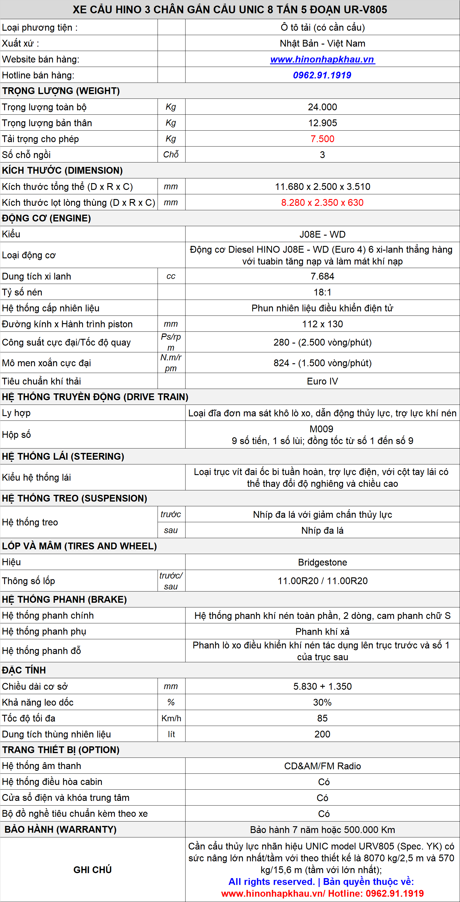* THÔNG SỐ, ĐẶC ĐIỂM KỸ THUẬT XE TẢI CẨU HINO 3 CHÂN GẮN CẨU 8 TẤN 5 ĐOẠN UNIC UR-V805: