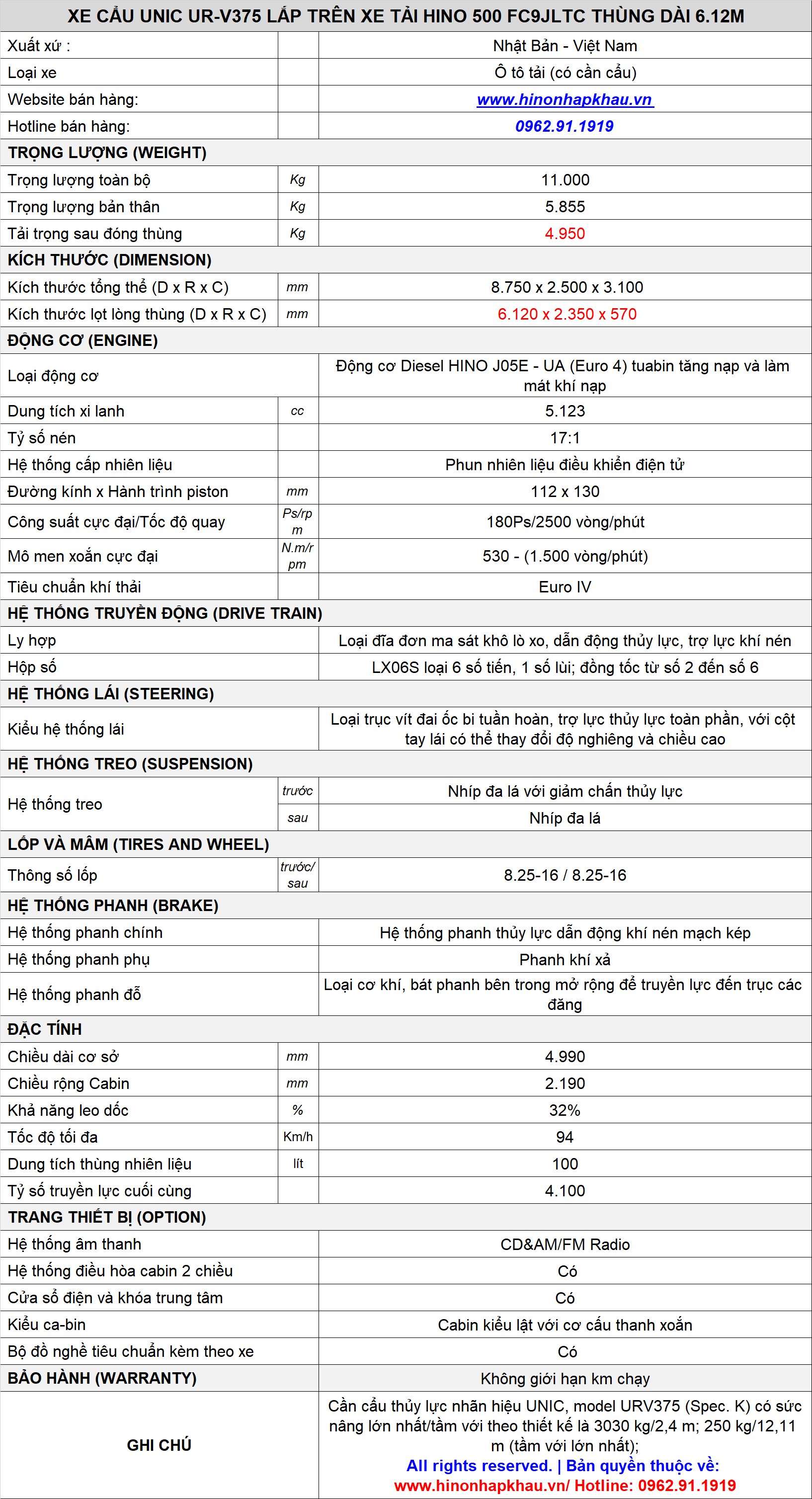 * THÔNG SỐ KỸ THUẬT XE CẦN CẨU THỦY LỰC UNIC URV375 LẮP TRÊN HINO 500 FC9JLTC ĐỜI 2021 - 2022: