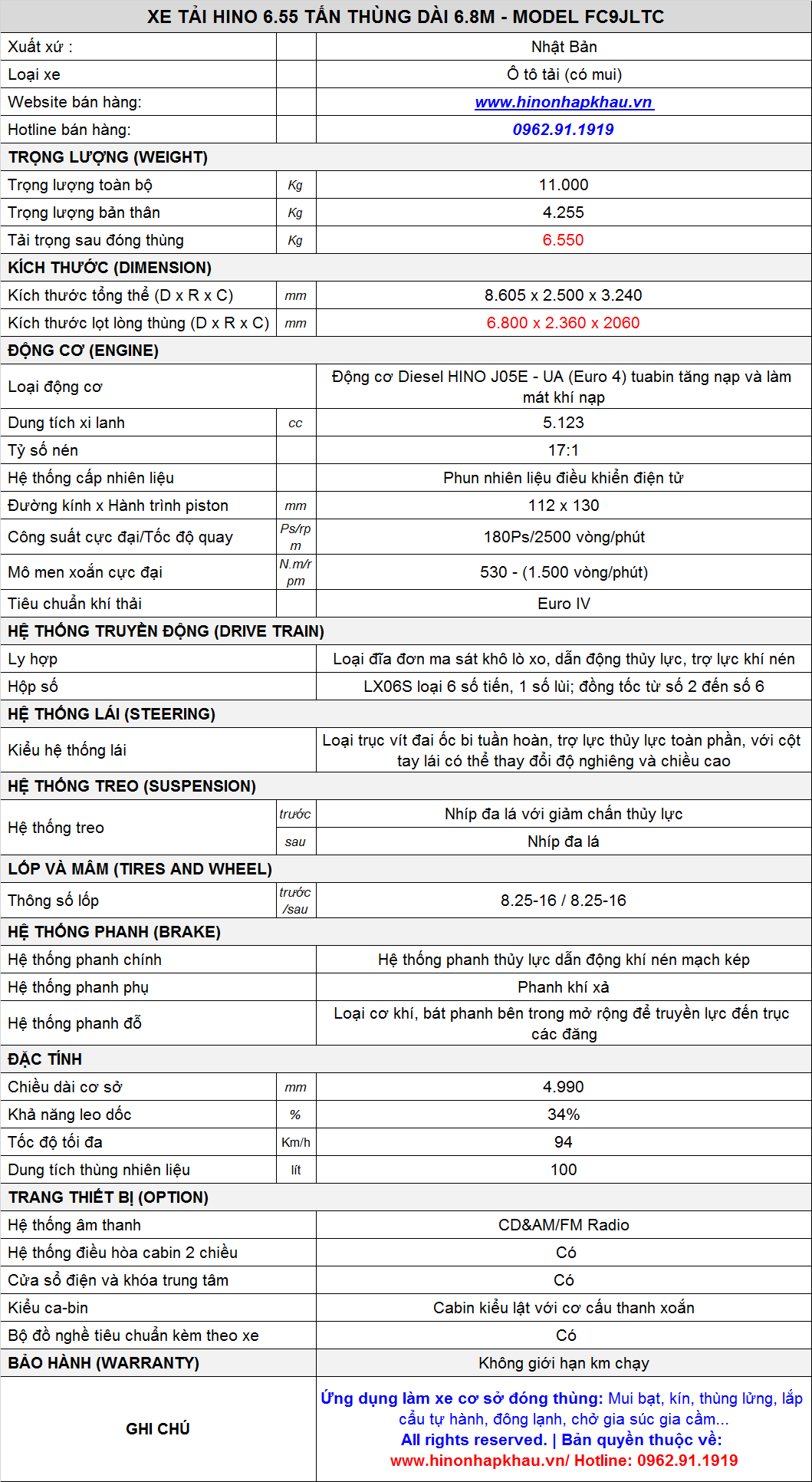 * THÔNG SỐ KỸ THUẬT XE TẢI HINO 6T5 HINO FC SERIES TẠI HẢI DƯƠNG :