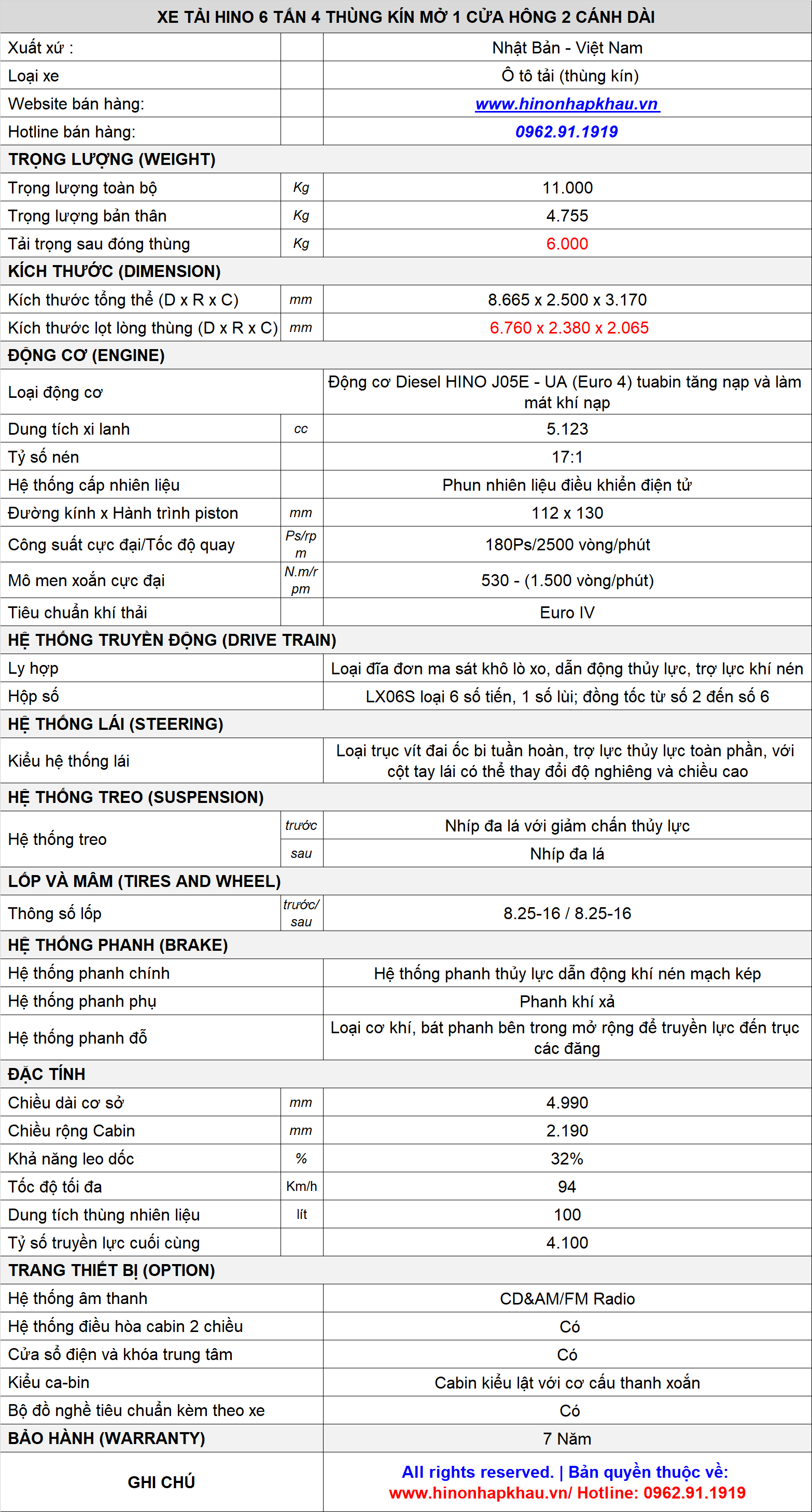 * ĐẶC TÍNH, THÔNG SỐ KỸ THUẬT XE TẢI HINO 6 TẤN TƯ THÙNG KÍN 1 CỬA HÔNG 2 CÁNH: