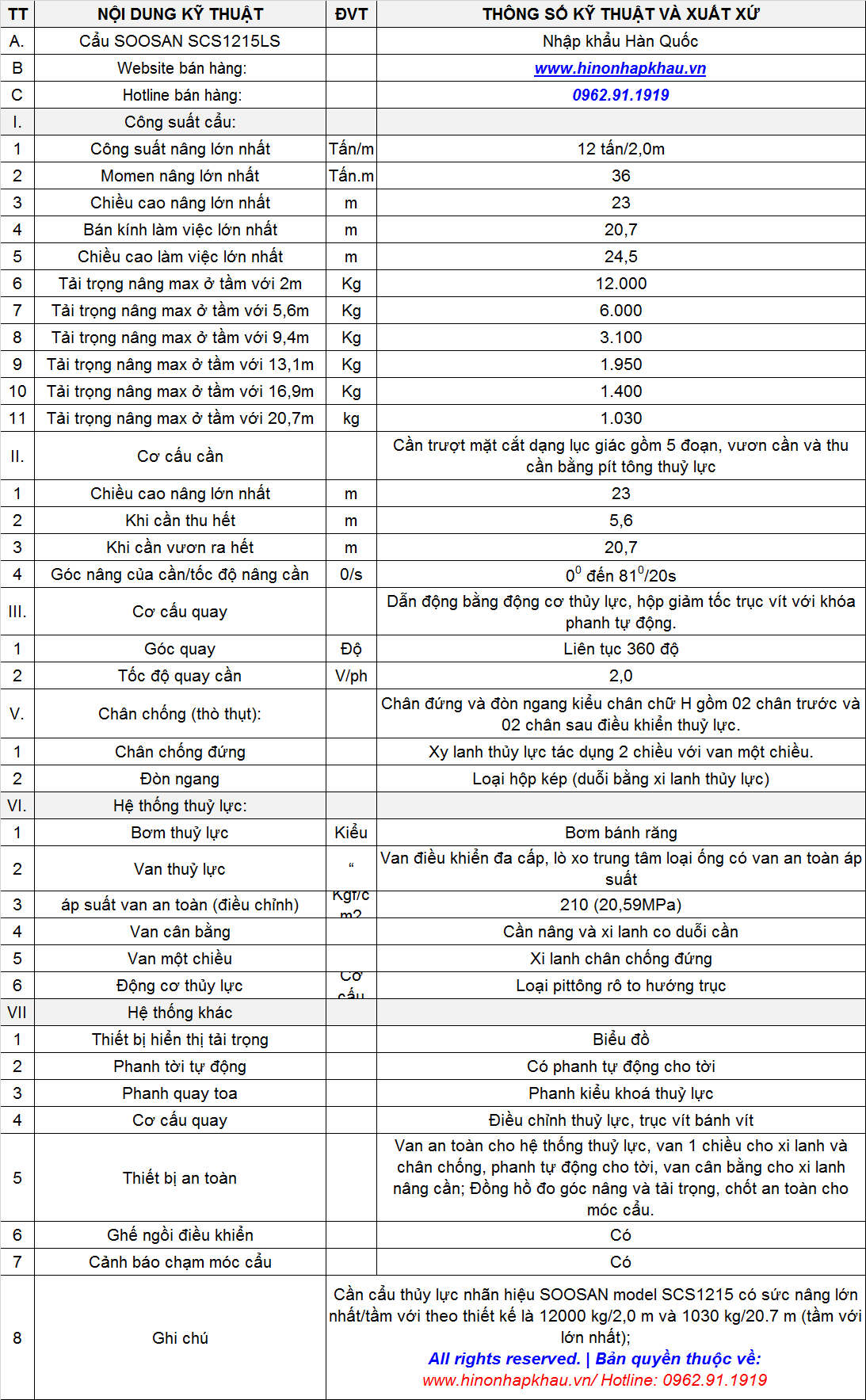 * THÔNG SỐ KỸ THUẬT CẨU TỰ HÀNH SOOSAN MODEL SCS1215Ls NHẬP KHẨU HÀN QUỐC: