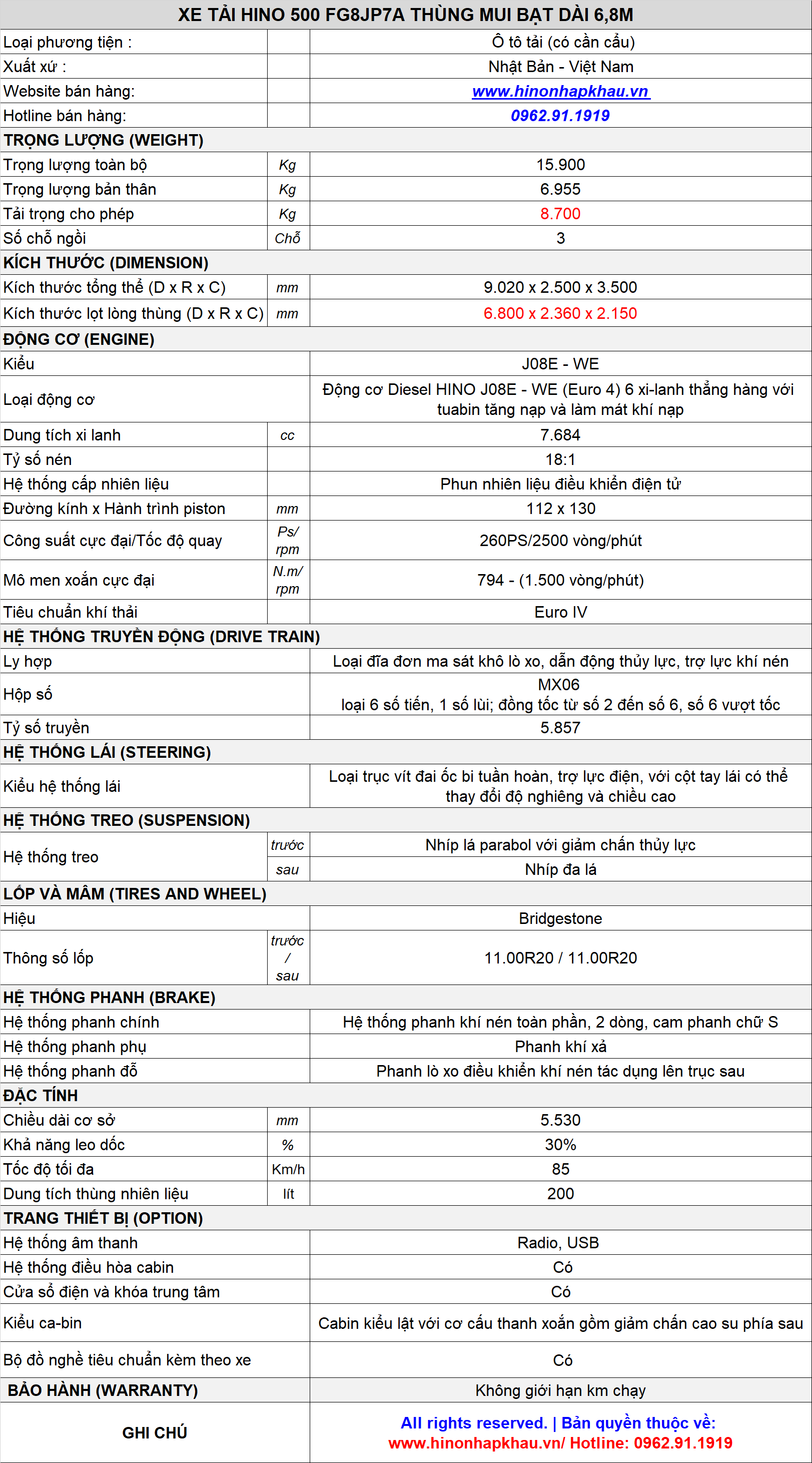 * ĐẶC TÍNH, THÔNG SỐ KỸ THUẬT Ô TÔ TẢI (THÙNG KÍN) 9 TẤN HINO 500 FG8JT7A THÙNG DÀI 8M9 ĐỜI 2022 - 2023: