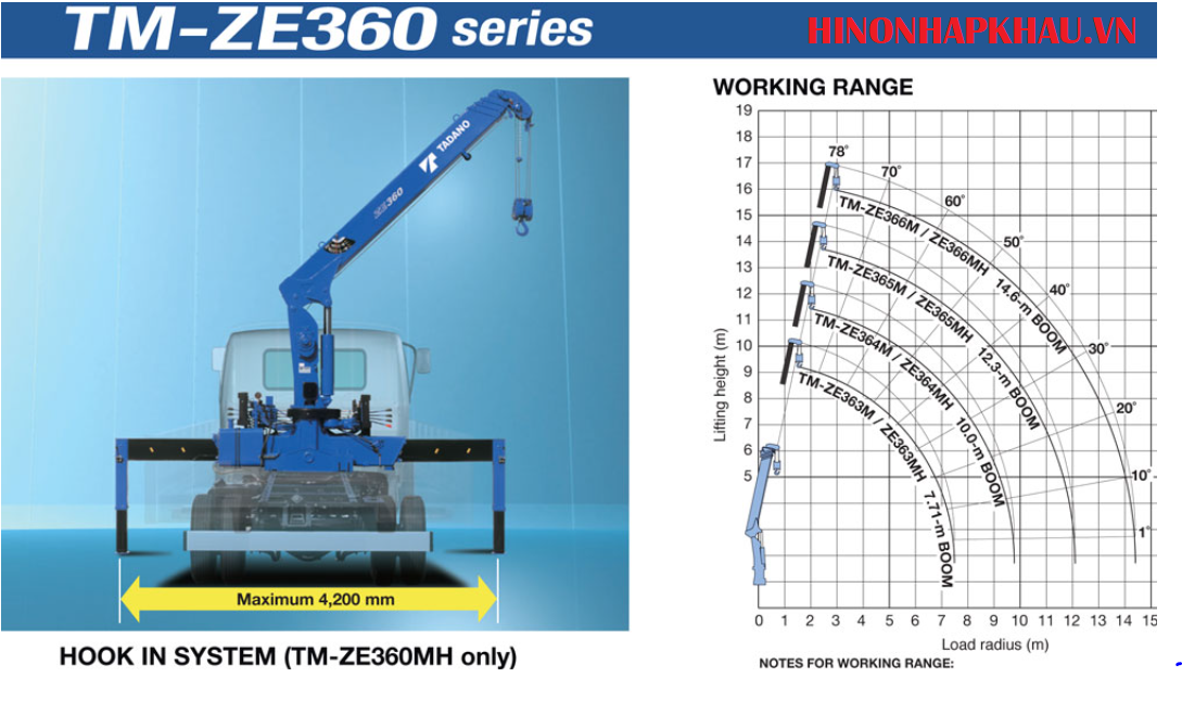 - Cẩu Tadano 3 tấn 6 đốt TM-ZE306MH: bán kính làm việc trong khoảng 3,65m - 14,4 m.