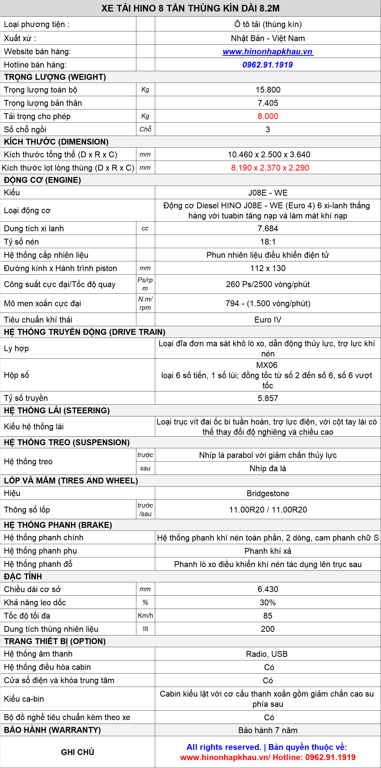 * ĐẶC TÍNH KỸ THUẬT XE TẢI HINO 8 TẤN THÙNG KÍN ĐỜI 2022 - 2023 PHIÊN BẢN EURO 4 MỚI NHẤT: