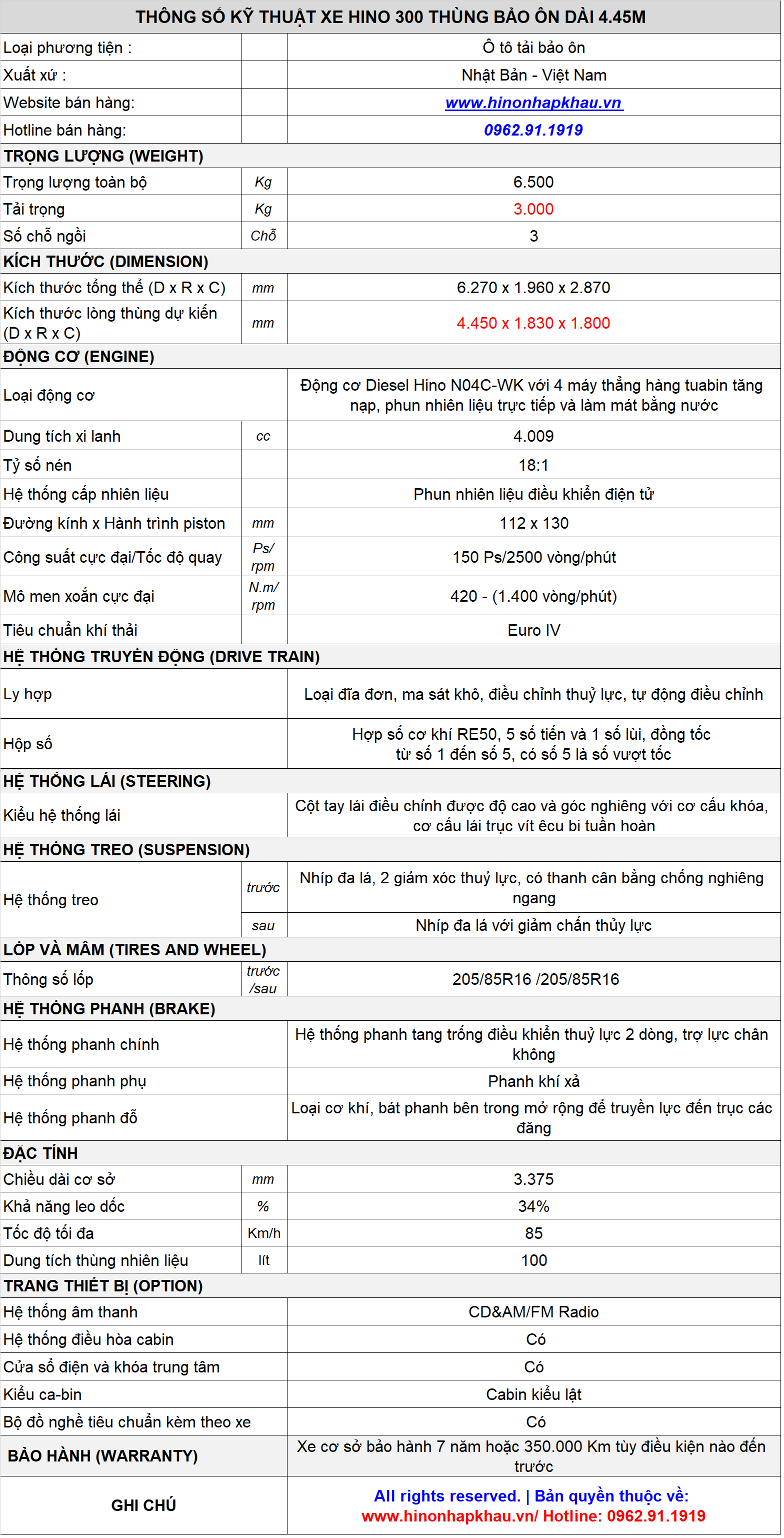* THÔNG SỐ, ĐẶC TÍNH KỸ THUẬT XE TẢI BẢO ÔN 3 TẤN HINO XZU650L-WBMRP3: