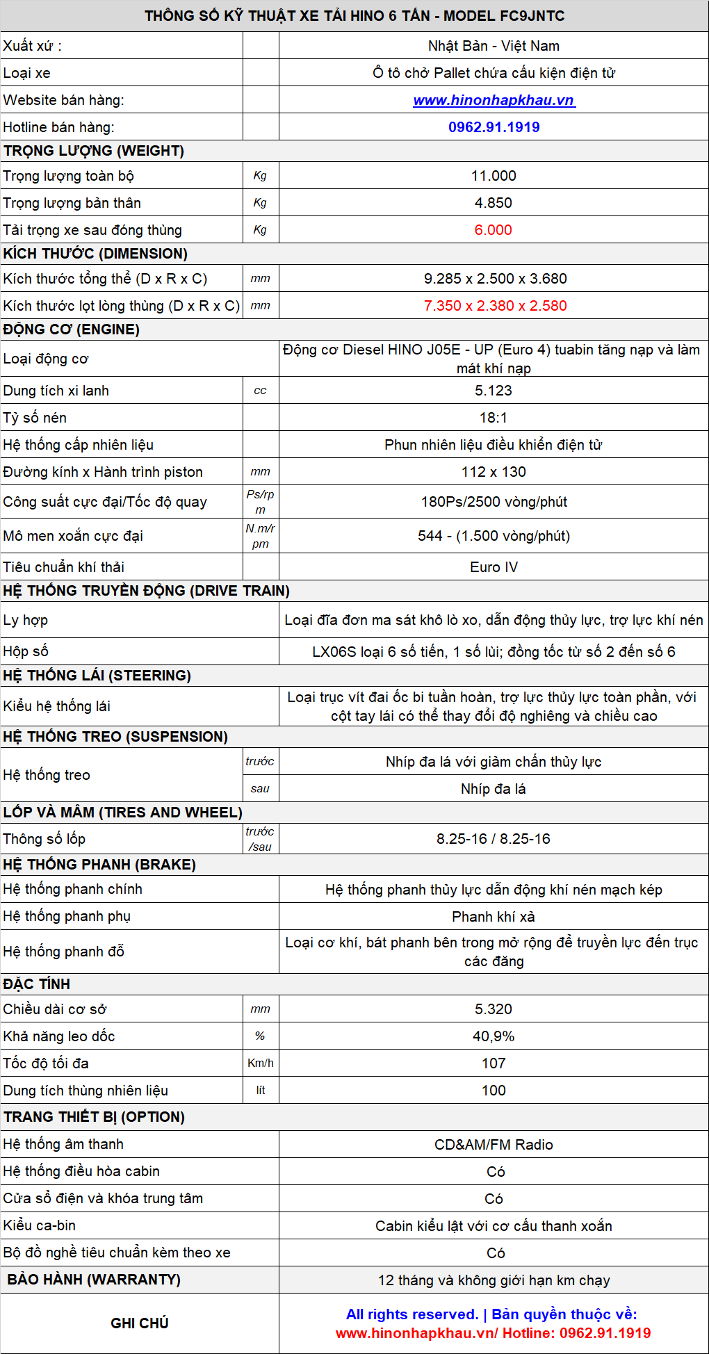 * THÔNG SỐ KỸ THUẬT XE TẢI HINO 6 TẤN FC9JNTC ĐỜI 2024 - 2025 :