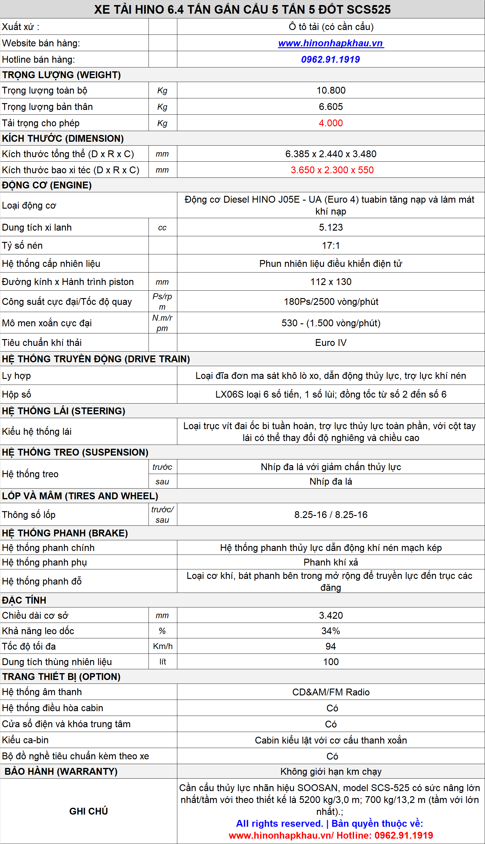 * THÔNG SỐ KỸ THUẬT XE CẨU THÙNG HINO 500 FC9JETC GẮN CẨU 5T2 5 ĐỐT SCS525:
