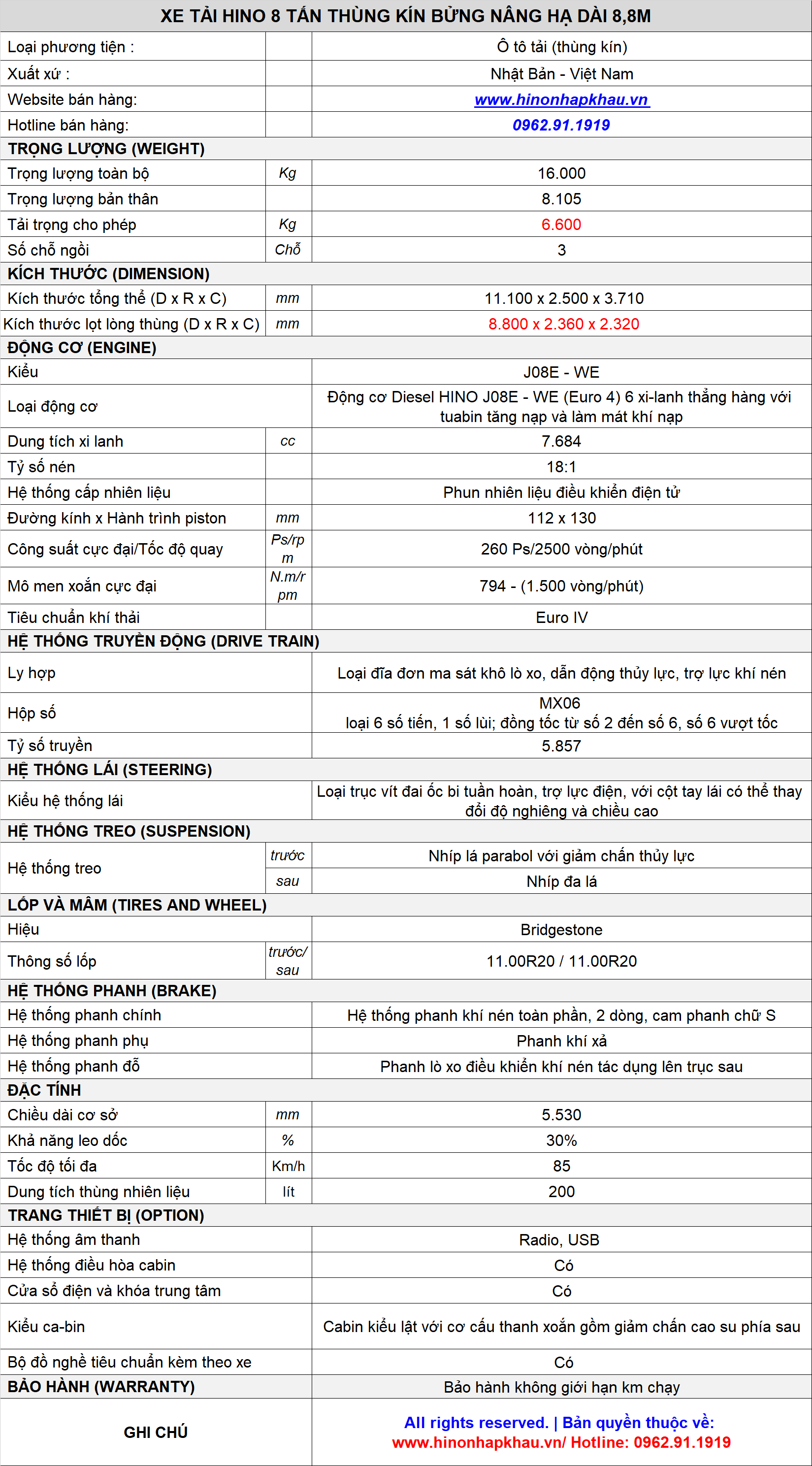 * THÔNG SỐ KỸ THUẬT XE THÙNG KÍN BỬNG NÂNG 8T HINO FG8JT7A EURO 4 MỚI NHẤT: