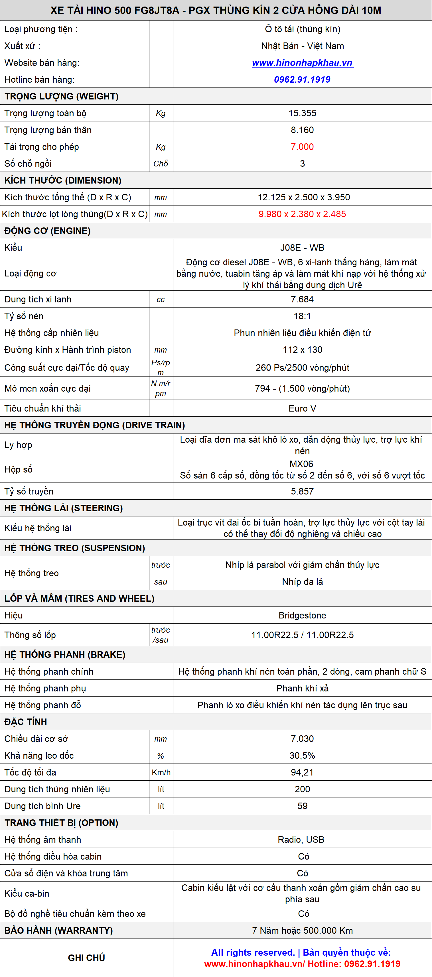 * THÔNG SỐ KỸ THUẬT XE HINO 8T MUI BẠT SUPER LONG 10 MÉT FG8JT8A-PGX ĐỜI NĂM 2025 -2026: