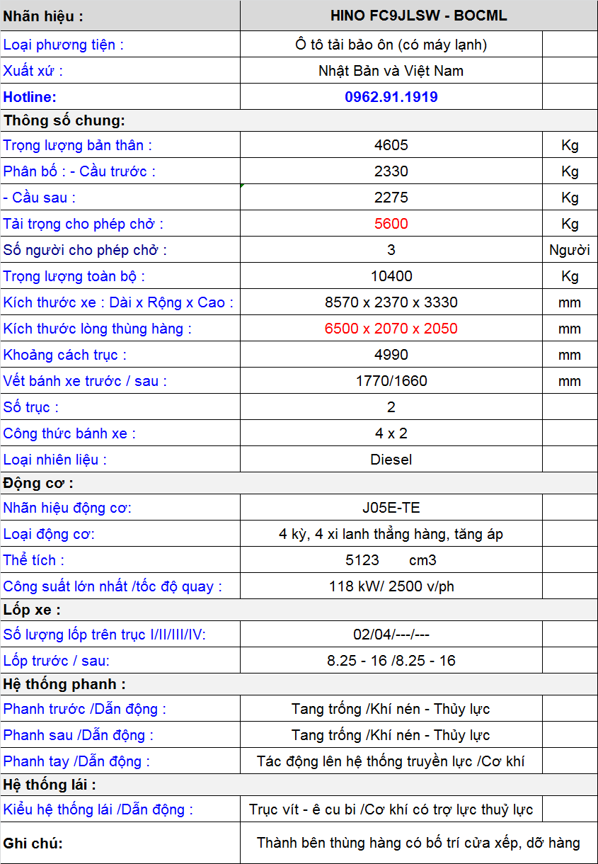 * Thông số kỹ thuật xe đông lạnh Hino 5,6 tấn: