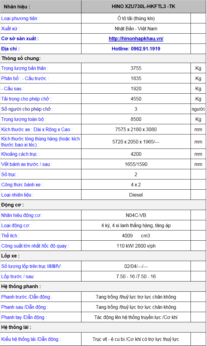 * Thông số kỹ thuật xe tải Hino 300 - Xe tải Hino XZU730L thùng kín:
