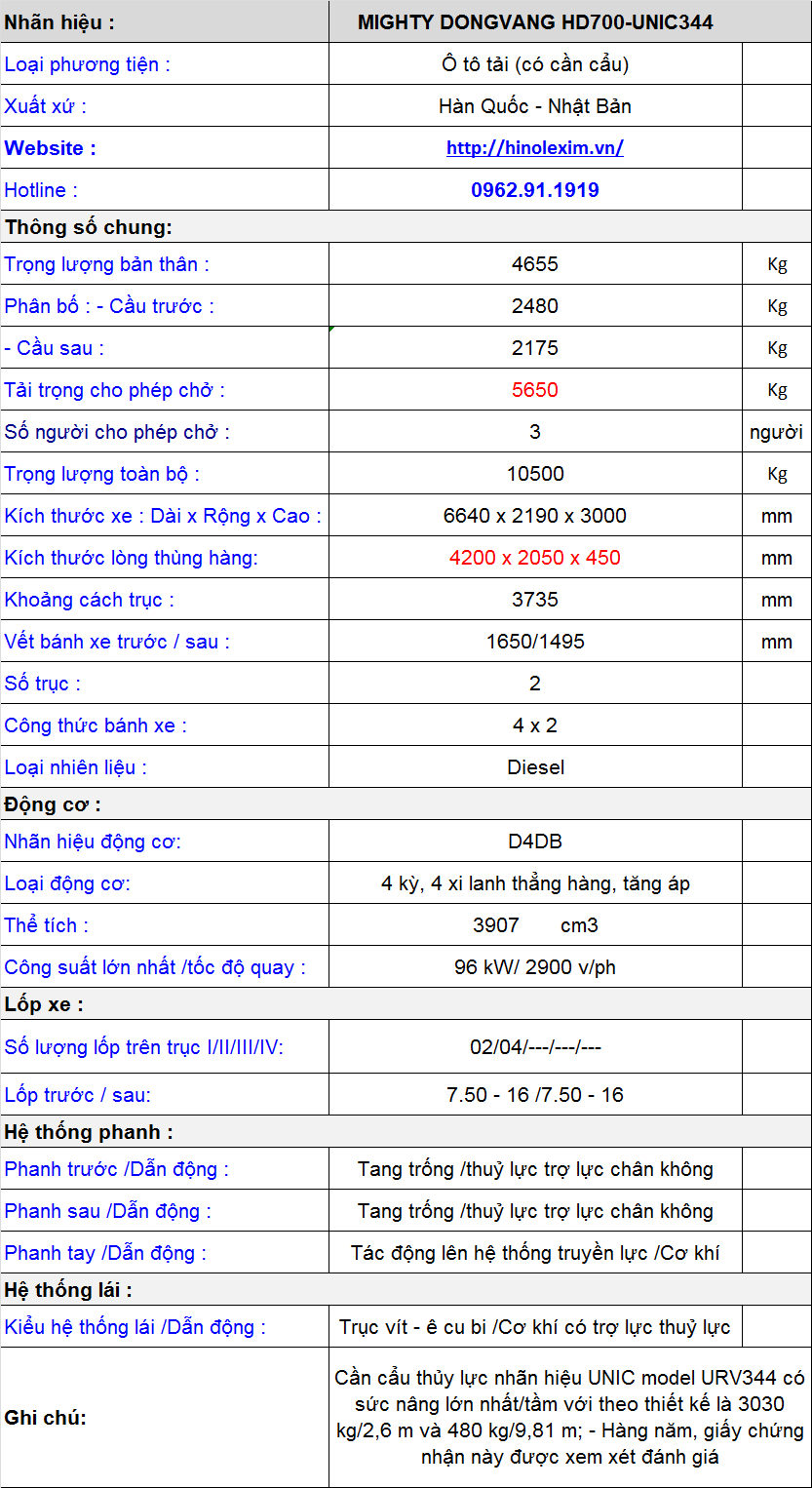 * Thông số kỹ thuật xe Hyundai nâng tải HD700 gắn cẩu 3 tấn 4 đốt Unic URV344: