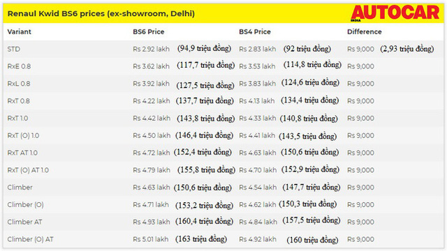 - Kwid facelift có giá dao động từ 2,76 - 4,76 lakh (90 triệu – 155 triệu đồng).