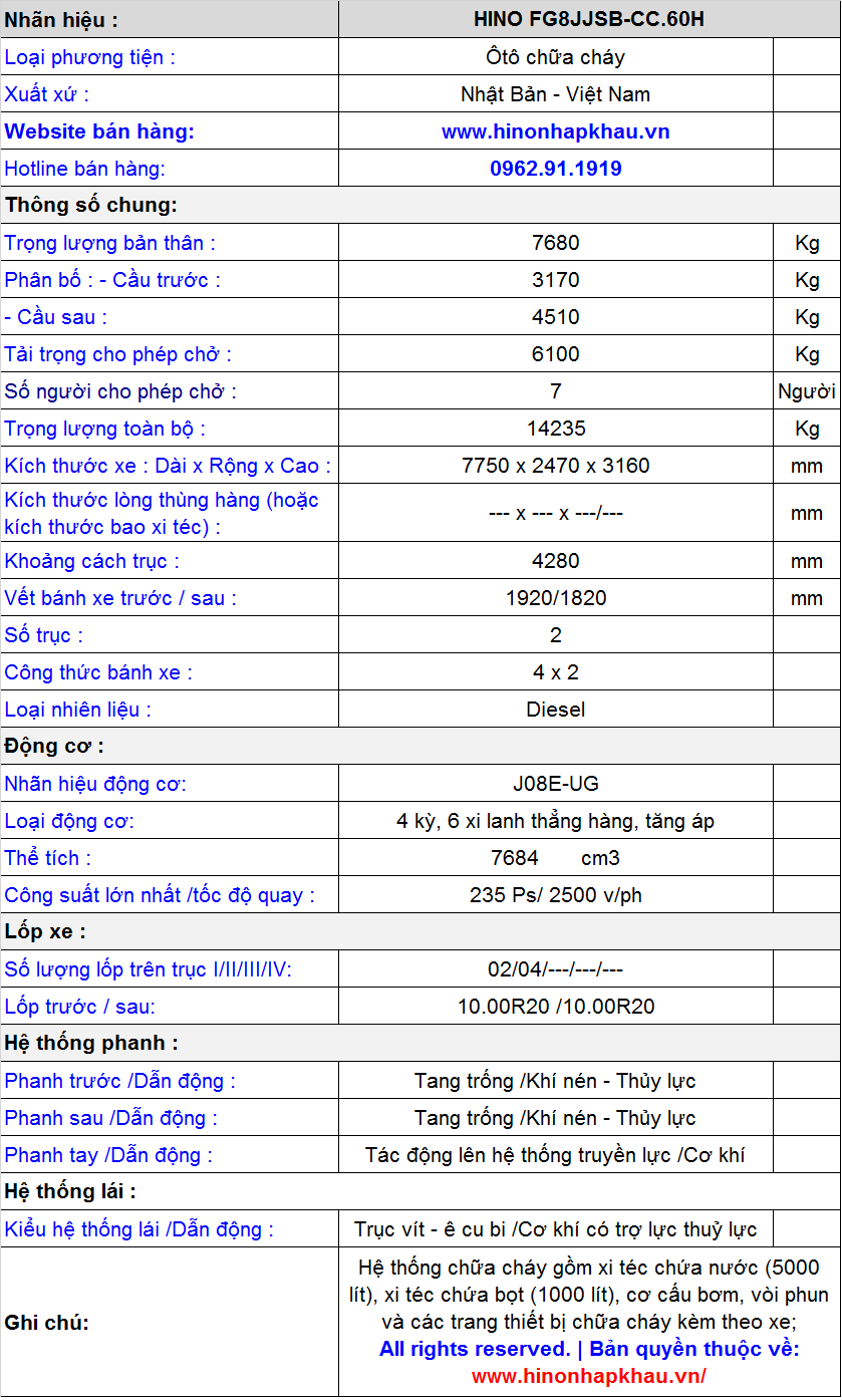 * Thông số kỹ thuật xe chữa cháy chuyên dụng 5 khối Hino FG8JJSB: