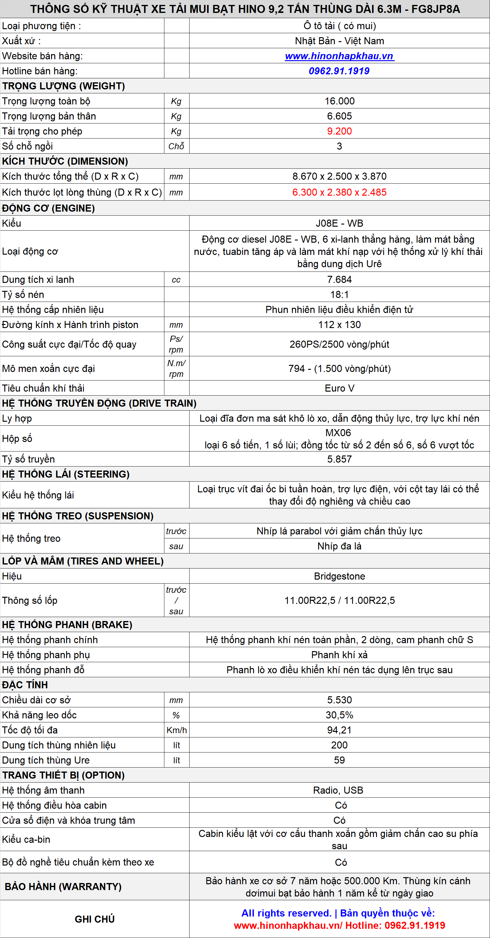 * THÔNG SỐ KỸ THUẬT Ô TÔ TẢI CÓ MUI BẠT 9.2 TẤN HINO 500 FG8JP8A EURO 5 THÙNG DÀI 6M3: