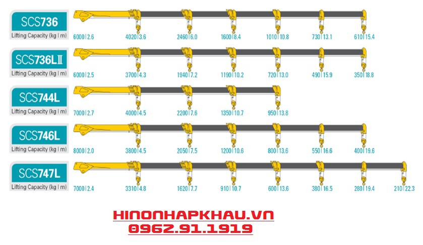 Cần cẩu thủy lực nhãn hiệu SOOSAN model SCS746 có sức nâng lớn nhất/tầm với theo thiết kế là 7000 kg/2,4 m và 400 kg/19,6 m (tầm với lớn nhất);