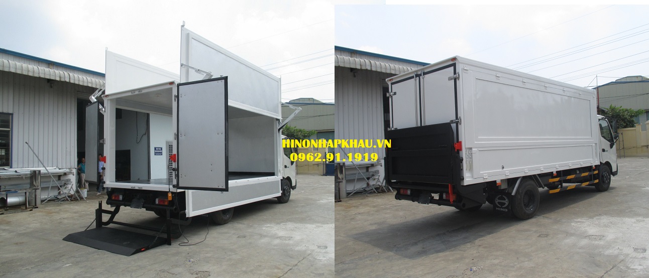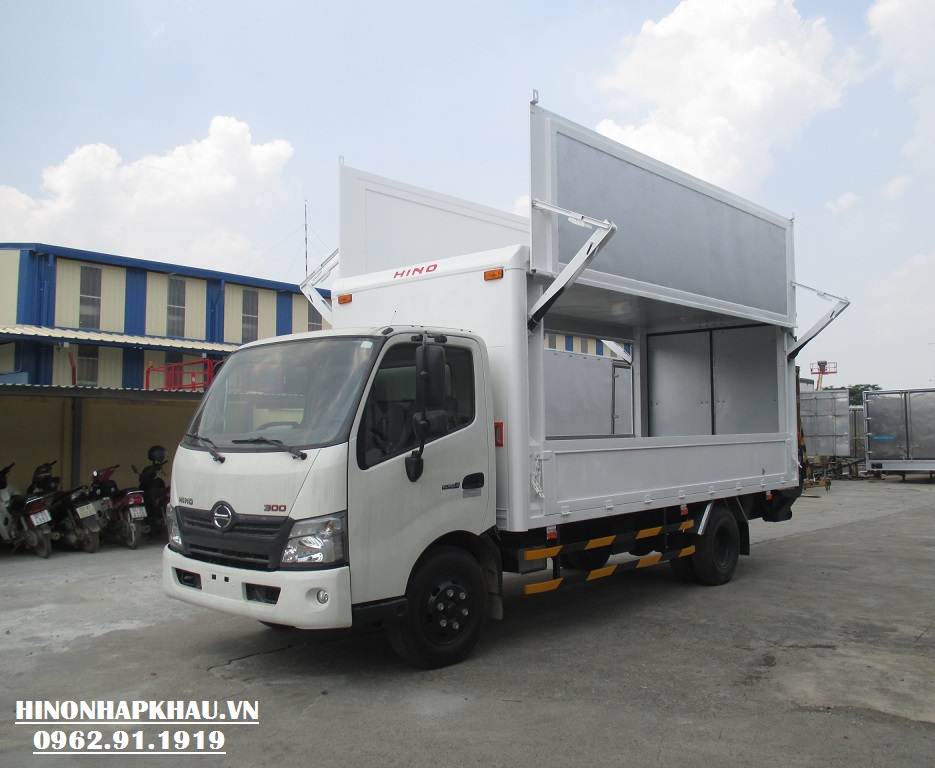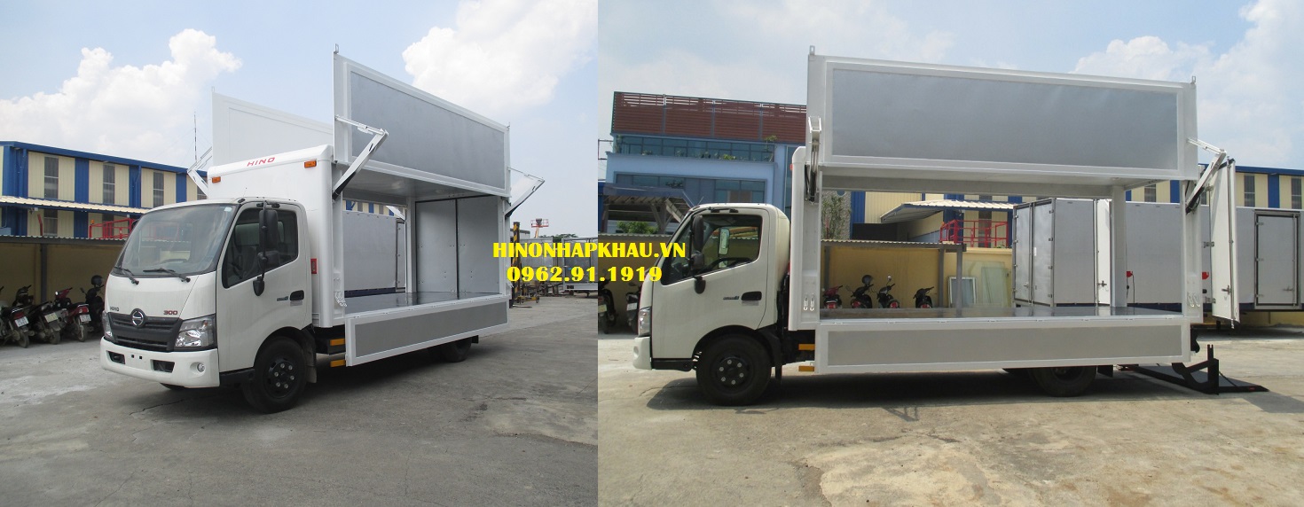 - Thùng xe lưu động hino 2T9 là loại thùng mở toan tất cả các cửa, các bửng ra ba phía tạo nên không gian rộng rãi cho người bán thực hiện việc bán hàng ngay trên thùng xe tải.