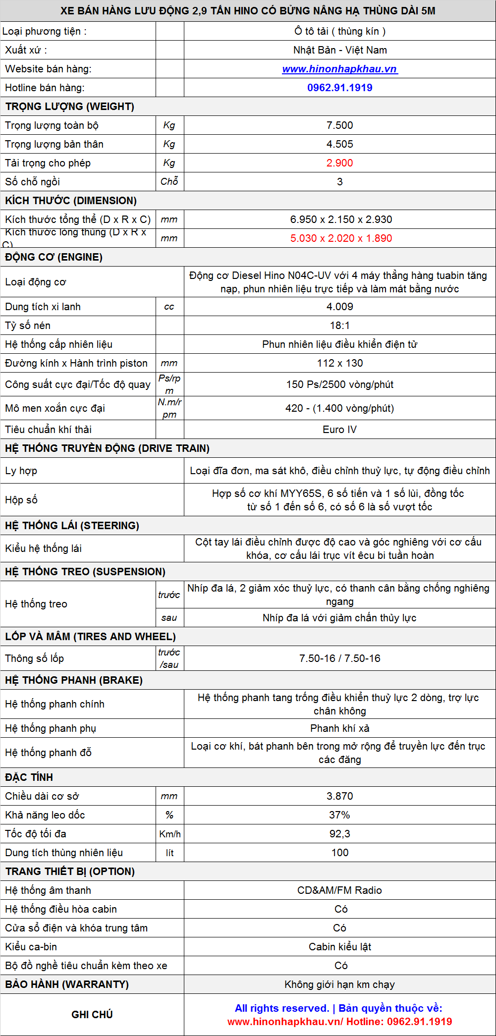 * THÔNG SỐ KỸ THUẬT XE BÁN HÀNG LƯU ĐỘNG HINO 2,9 TẤN BỬNG NÂNG THÙNG DÀI 5M ĐỜI NĂM 2020 - 2021: