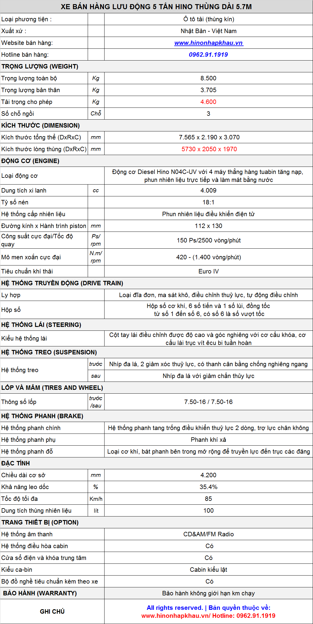 * THÔNG SỐ KỸ THẬT XE BÁN HÀNG LƯU ĐỘNG 5 TẤN HINO XZU730L ĐỜI NĂM 2020 - 2021 MỚI NHẤT: