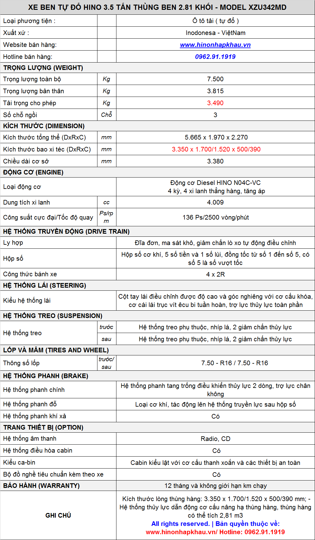 - Xuất xứ: xe cơ sở hino 3.5 tấn nhập khẩu nguyên chiếc từ nhà máy Hino Indonesia. Hệ thống thùng ben sản xuất tại Việt Nam với hệ thống nâng ben nhập khẩu.