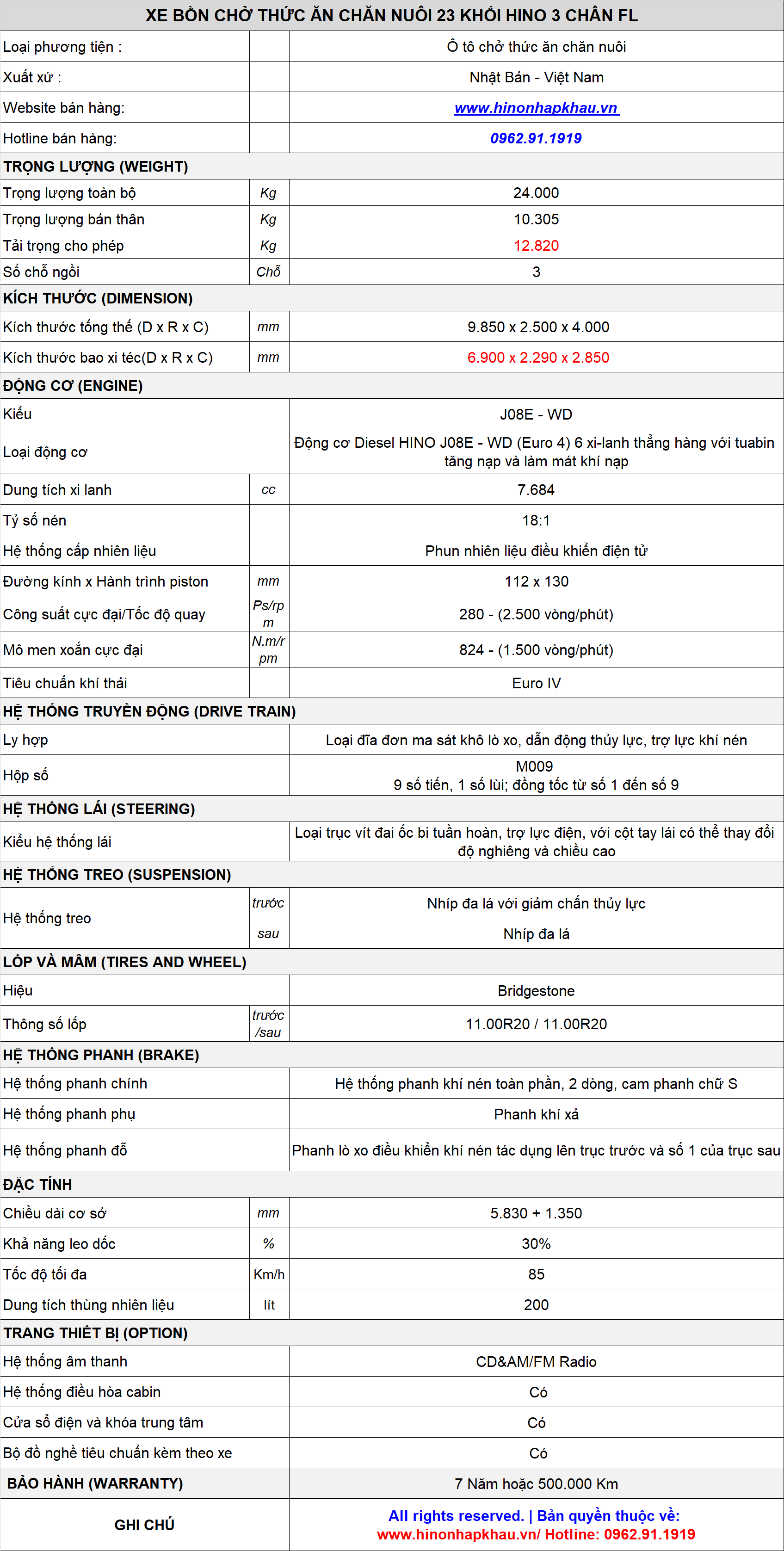 Với thương hiệu và chất lượng đã được khẳng định trên thị trường Việt Nam cũng như trên toàn thế giới, cùng với dịch vụ chăm sóc hậu mãi sau bán hàng, dịch vụ bảo dưỡng, chăm sóc uy tín chất lượng cao. Xe tải hino chở thức ăn chăn nuôi 23 khối Hino FL luôn luôn là " Sự lựa chọn hoàn hảo " cho tất cả mọi Khách hàng.