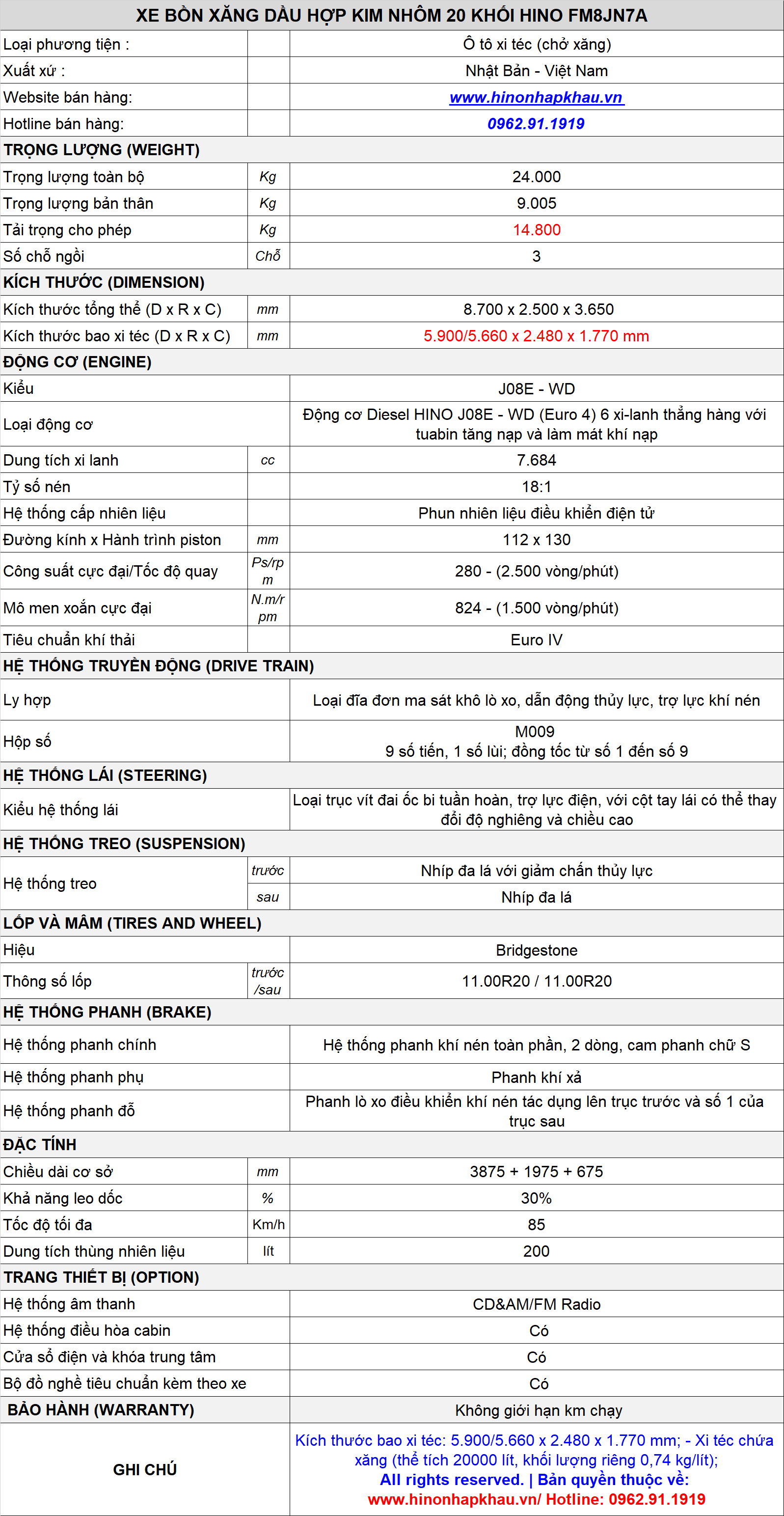 * THÔNG SỐ KỸ THUẬT XE BỒN XĂNG DẦU HỢP KIM NHÔM 20 KHỐI (20M3) HINO FM8JN7A ĐỜI 2021 - 2022: