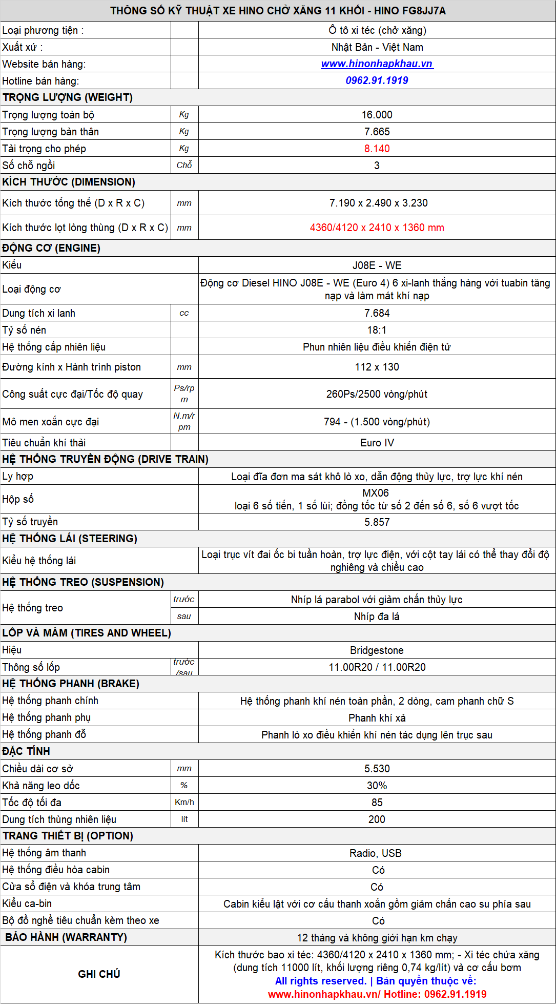 Xe bồn téc chở xăng 11m3 Hino FG8JJ7A - Xe Hino FG téc xăng dầu 11 khối :