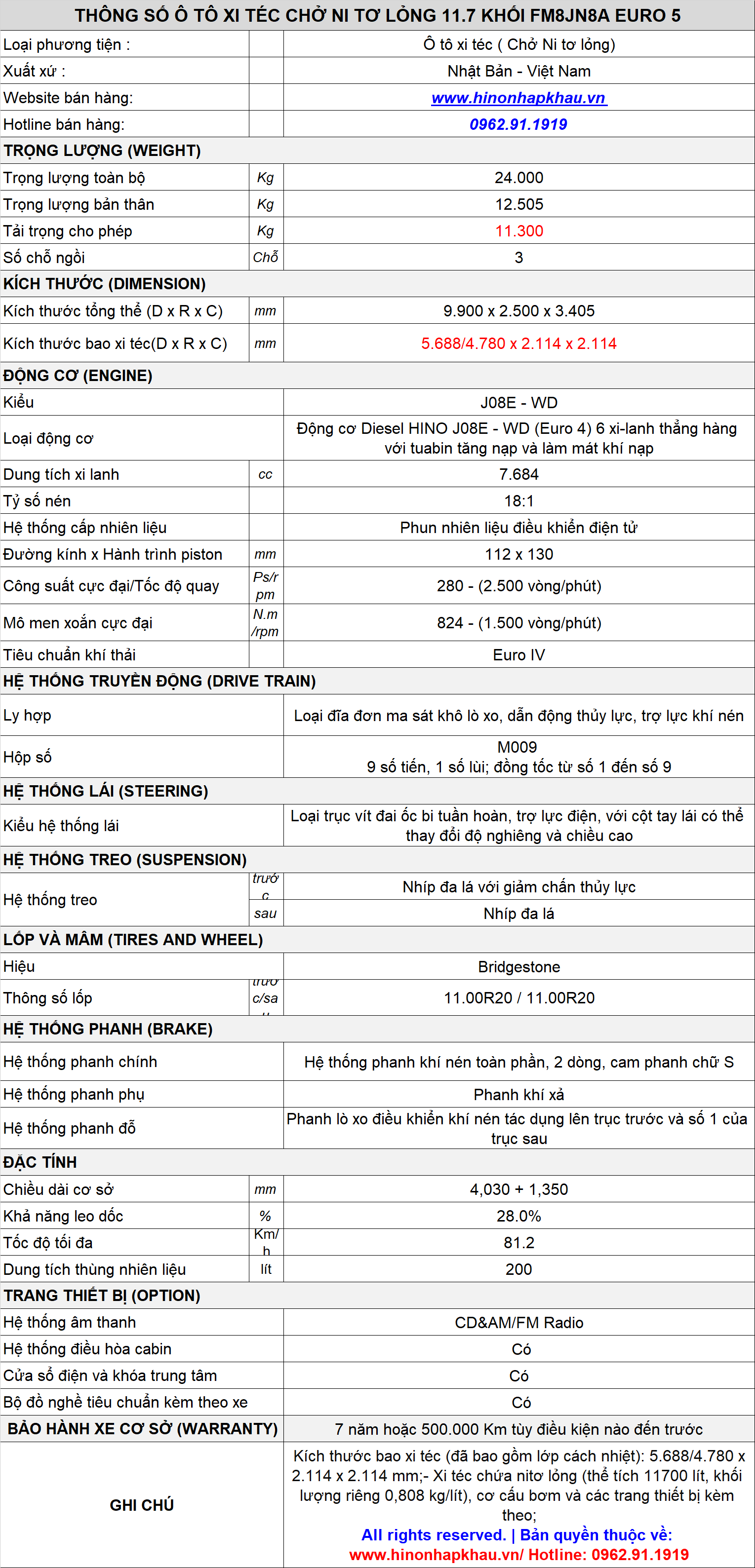 * THÔNG SỐ KỸ THUẬT XE HINO 3 CHÂN FL E5 LẮP BỒN CHỞ NI TƠ LỎNG 12M3 :