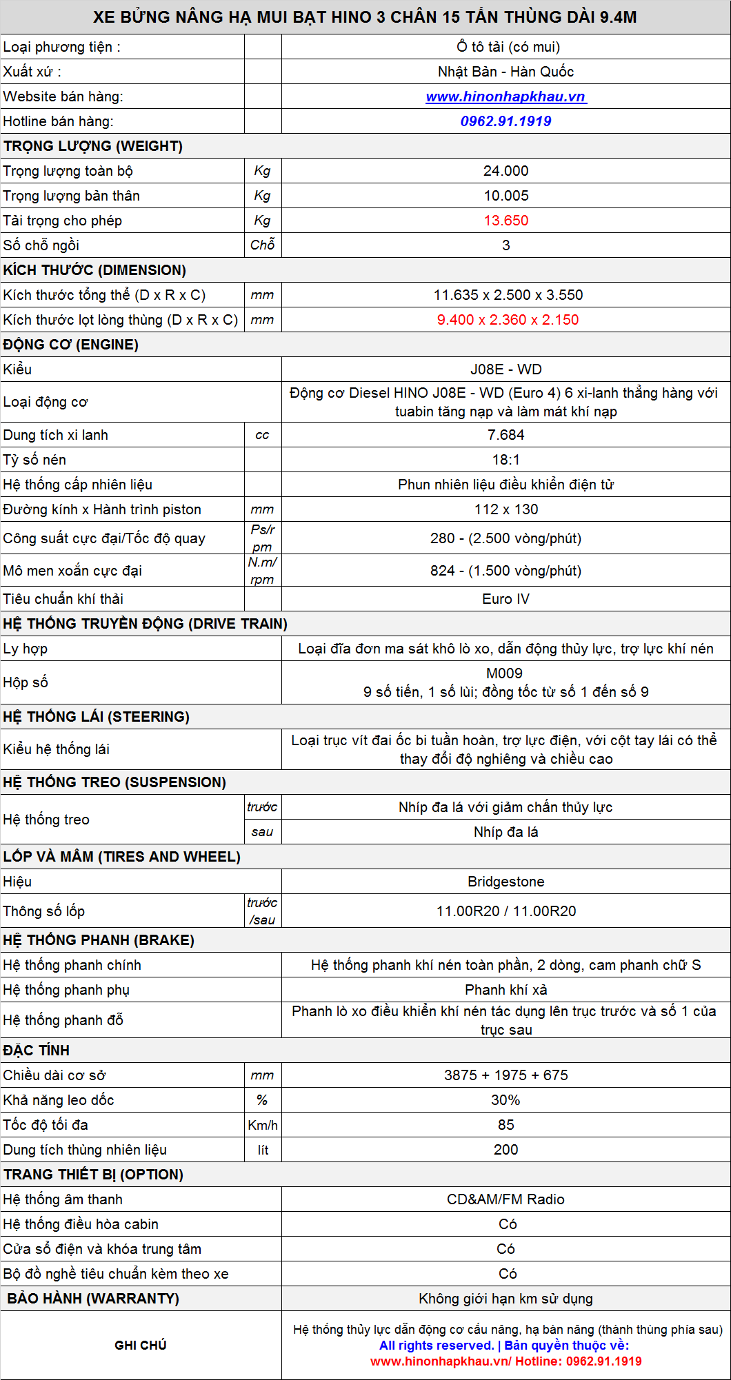 - Xuất xứ xe hino cơ sở: Linh kiện nhập khẩu 3 cục đồng bộ từ nhà máy Hino Motors Nhật Bản, lắp ráp tại nhà máy Hino Motors Việt Nam. Hệ thống bửng nâng hạ dạng cáp kéo hoặc ty đẩy thủy lực sản xuất tại Việt Nam với bơm nhâp khẩu