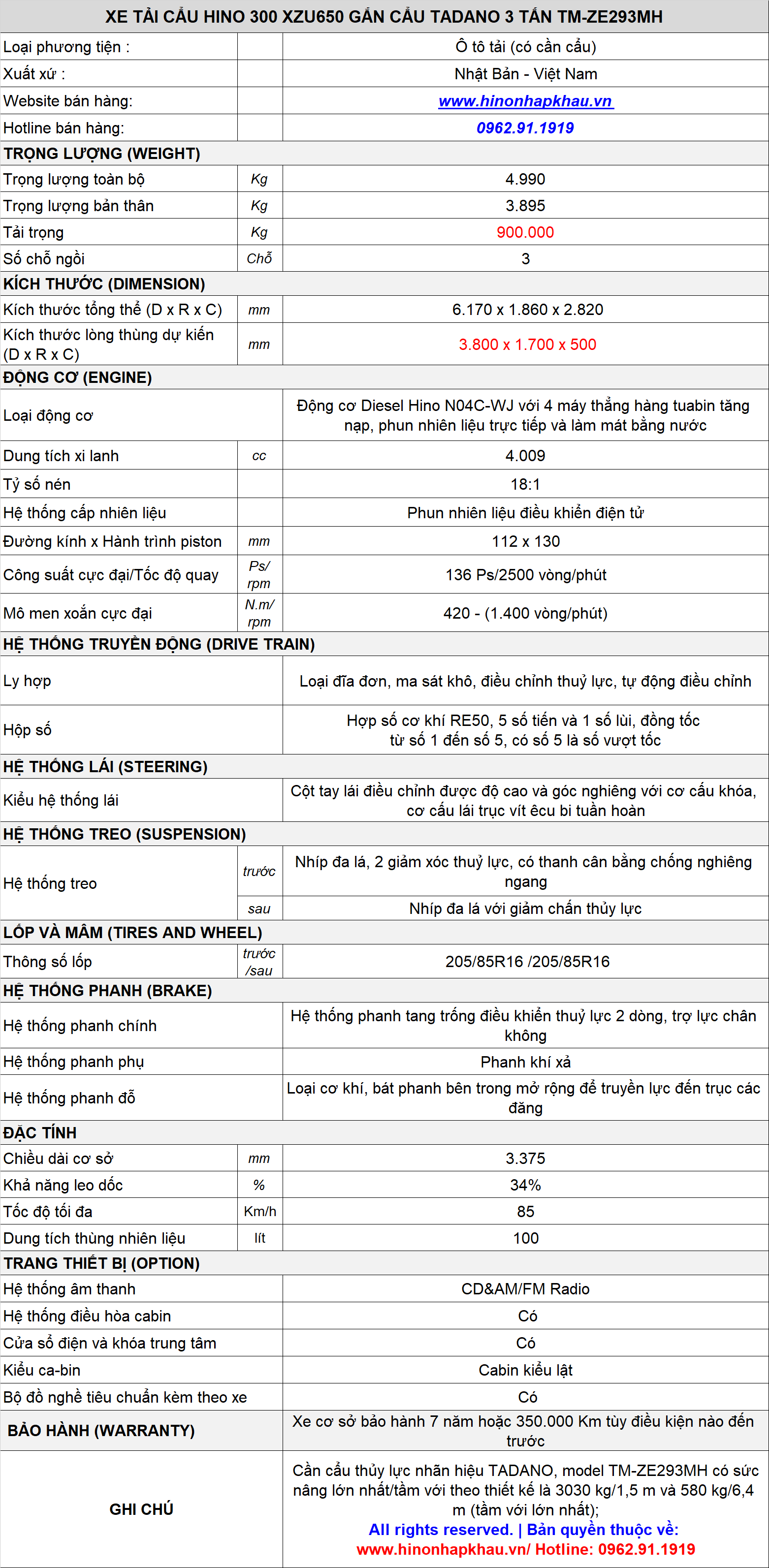 * THÔNG SỖ KỸ THUẬT XE TẢI CẨU HINO 300 XZU650L GẮN CẨU TADANO 3 TẤN TM-ZE293MH: