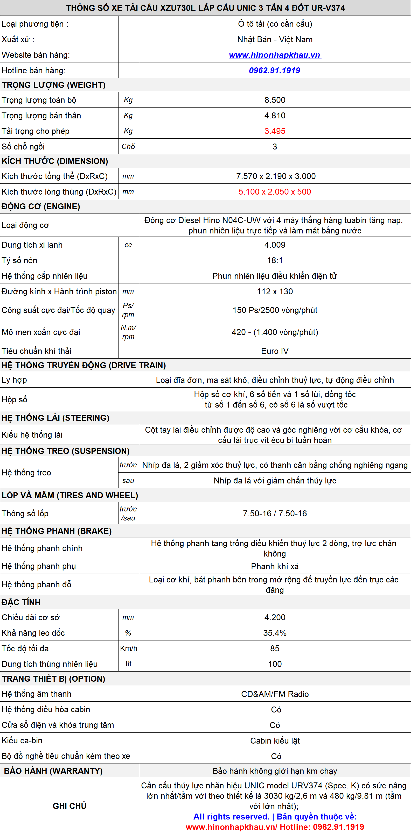 - Xuất xứ: cẩu UNIC URV344 nhập khẩu nguyên chiếc Unic Thái Lan
