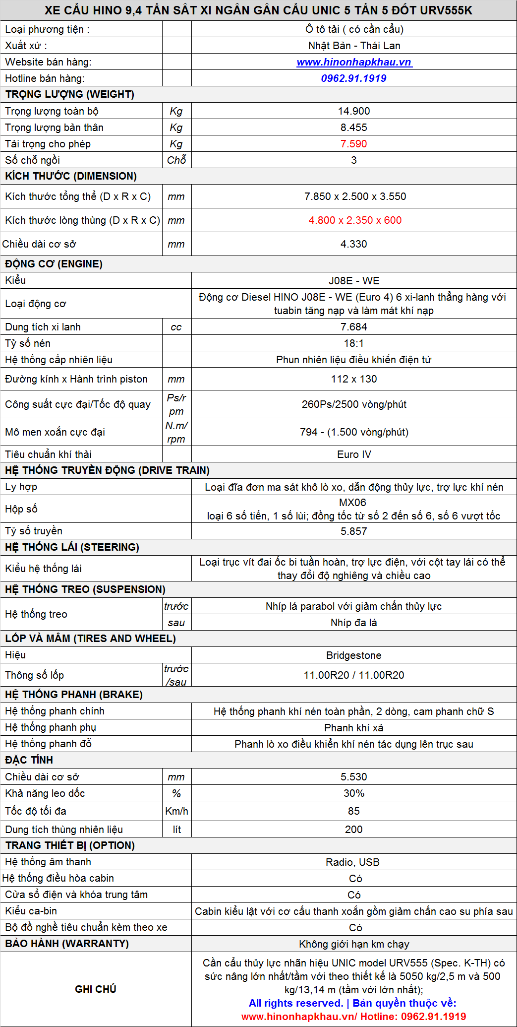 * THÔNG SỐ KỸ THUẬT XE CẨU HINO 9T4 TẤN FG GẮN CẨU UNIC 5 TẤN 5 ĐỐT URV555K: