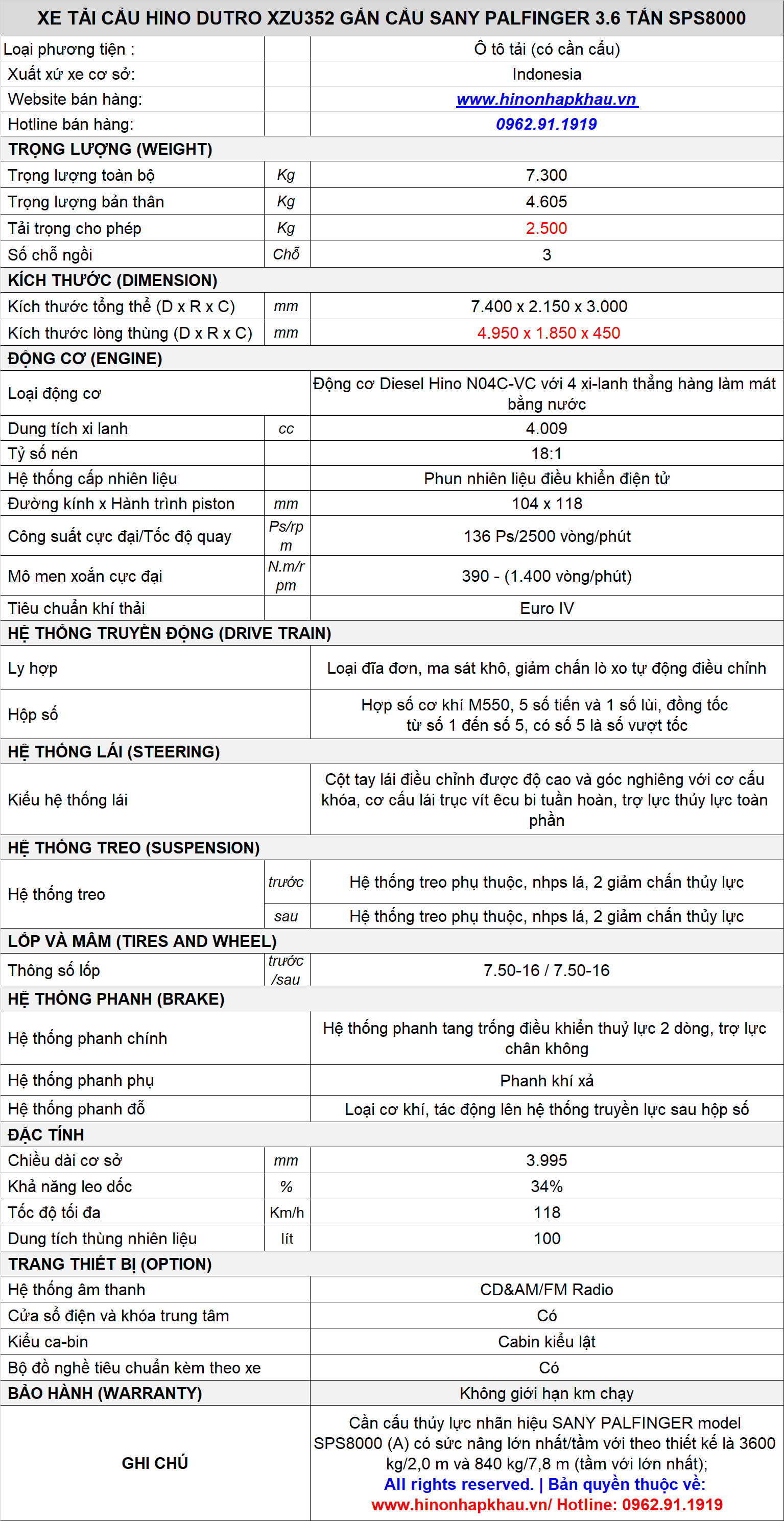 * THÔNG SỐ KỸ THUẬT XE CẦN CẨU HINO DUTRO XZU352 LẮP CẨU SANY PALFINGER SPS8000: