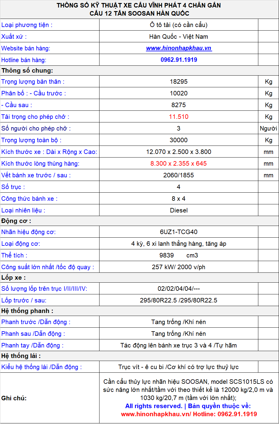 - Xe cơ sở lắp ráp trong nước. Cẩu tự hành Soosan 12 tấn 5 đốt bán kính làm việc 20,7m được nhập khẩu từ nhà máy Soosan Hàn Quốc.