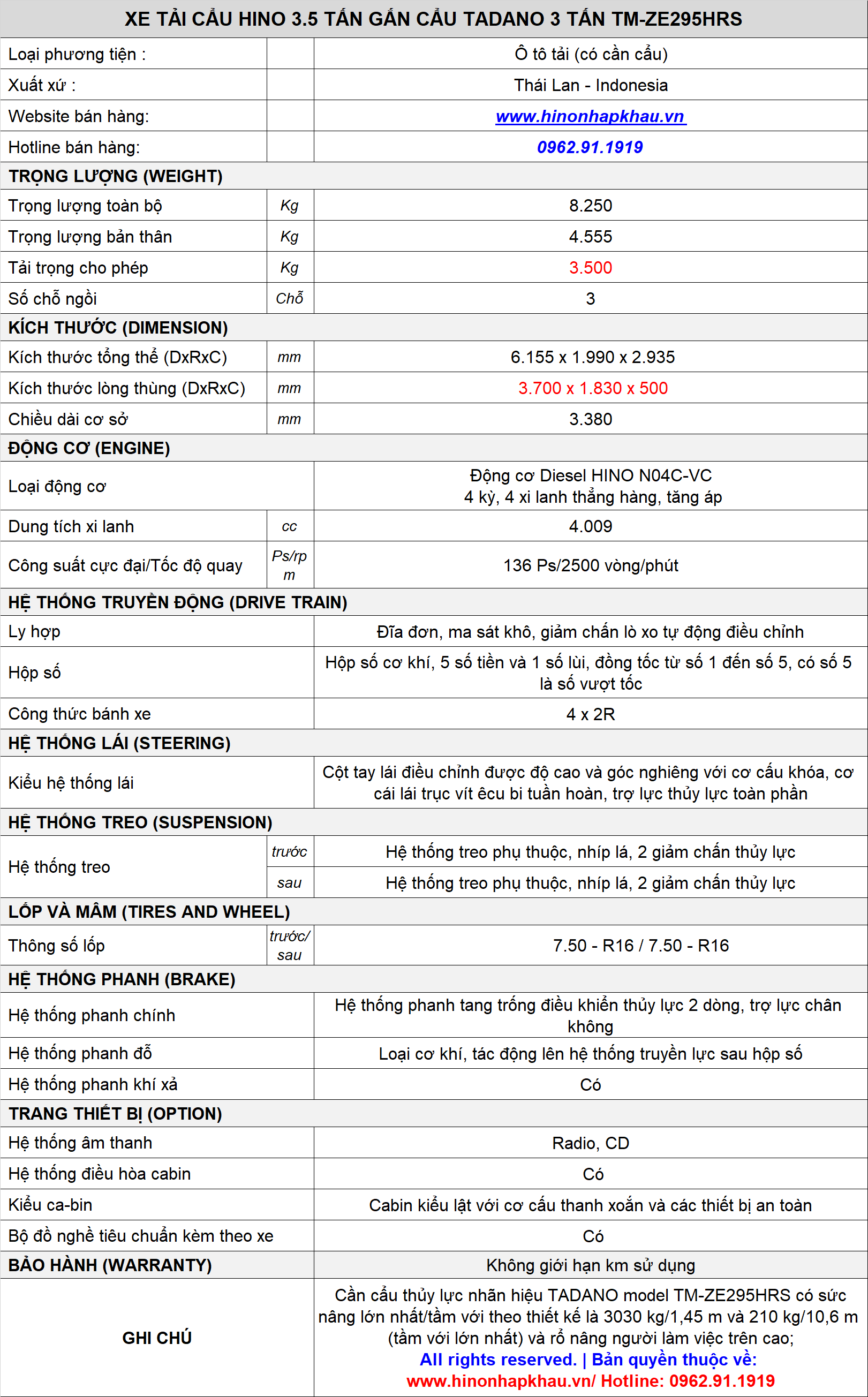THÔNG SỐ, ĐẶC TÍNH KỸ THUẬT XE TẢI HINO 3T5 GẮN CẨU TADANO 3 TẤN 5 ĐỐT CÓ GIỎ NÂNG NGƯỜI LÀM VIỆC TRÊN CAO: