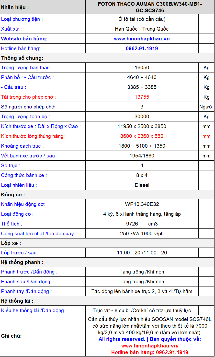 * Thông số kỹ thuật xe cẩu tự hành 7 tấn Auman C300B :