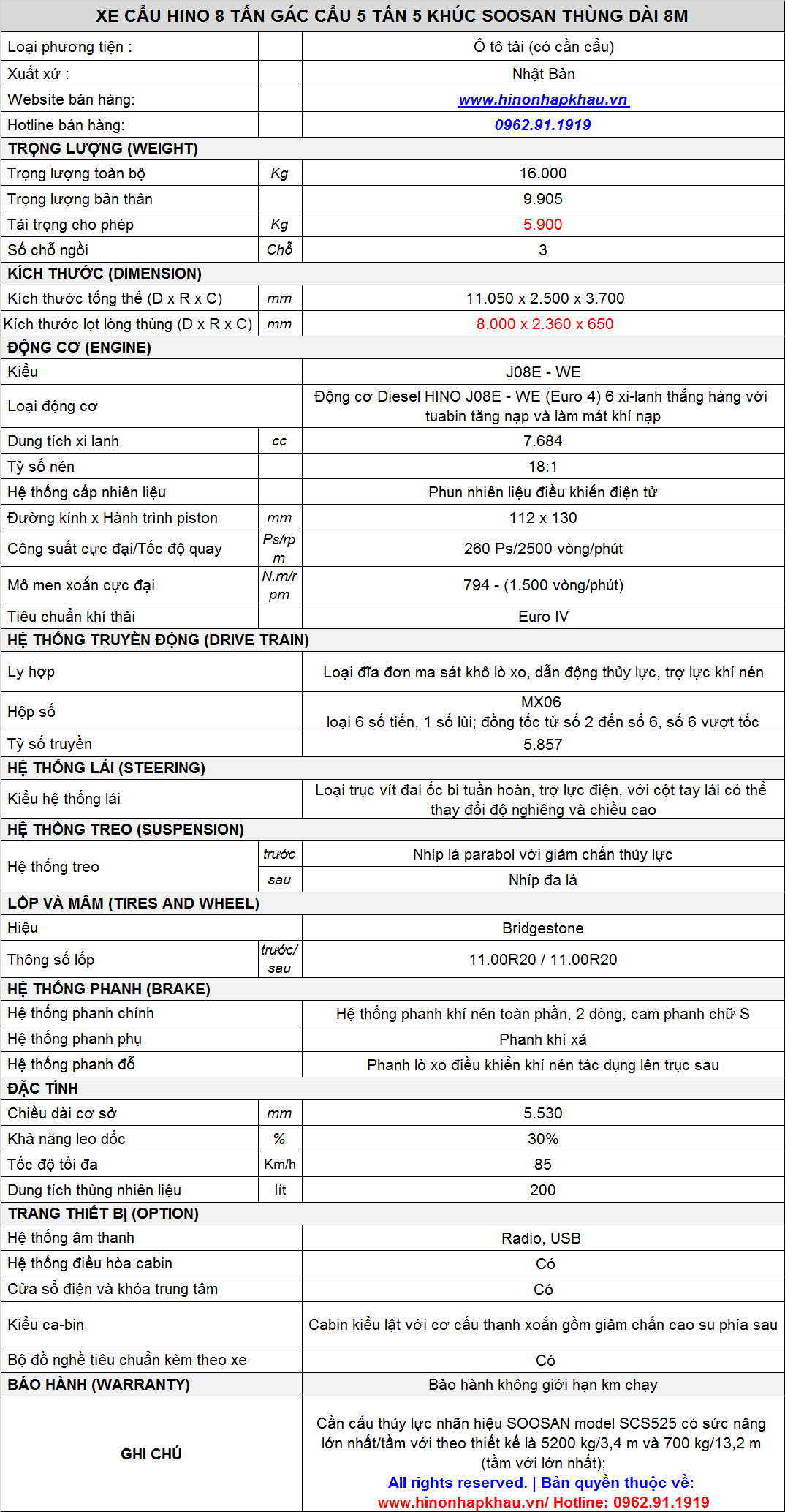 * THÔNG SỐ KỸ THUẬT XE CẨU THÙNG 16 TẤN HINO 500 FG8JT8A BẢN THÙNG DÀI 8M SAU GẮN CẨU 5 TẤN 5 ĐOẠN SCS525: