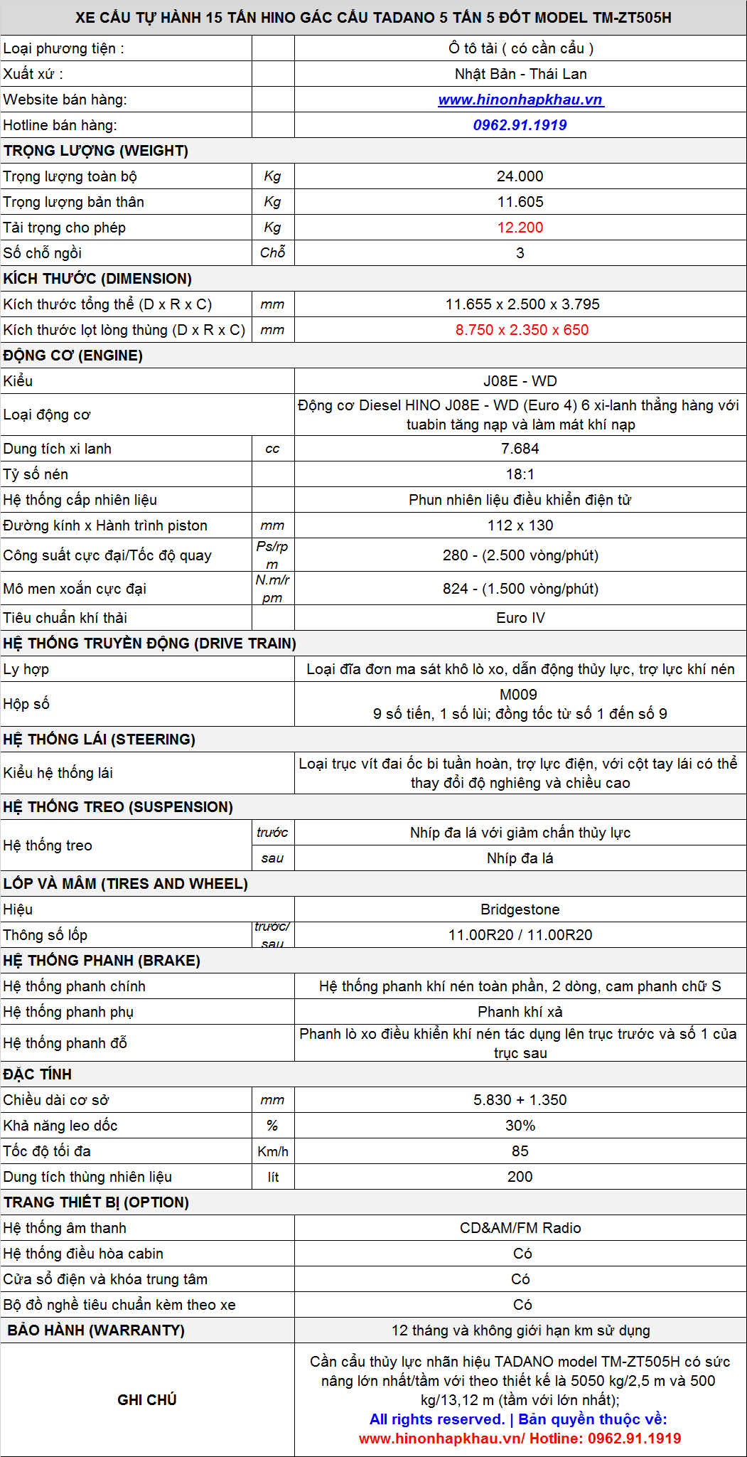 * THÔNG SỐ KỸ THUẬT XE CẨU TỰ HÀNH 15T HINO FL LẮP CẨU TADANO 5 TẤN 5 ĐỐT :