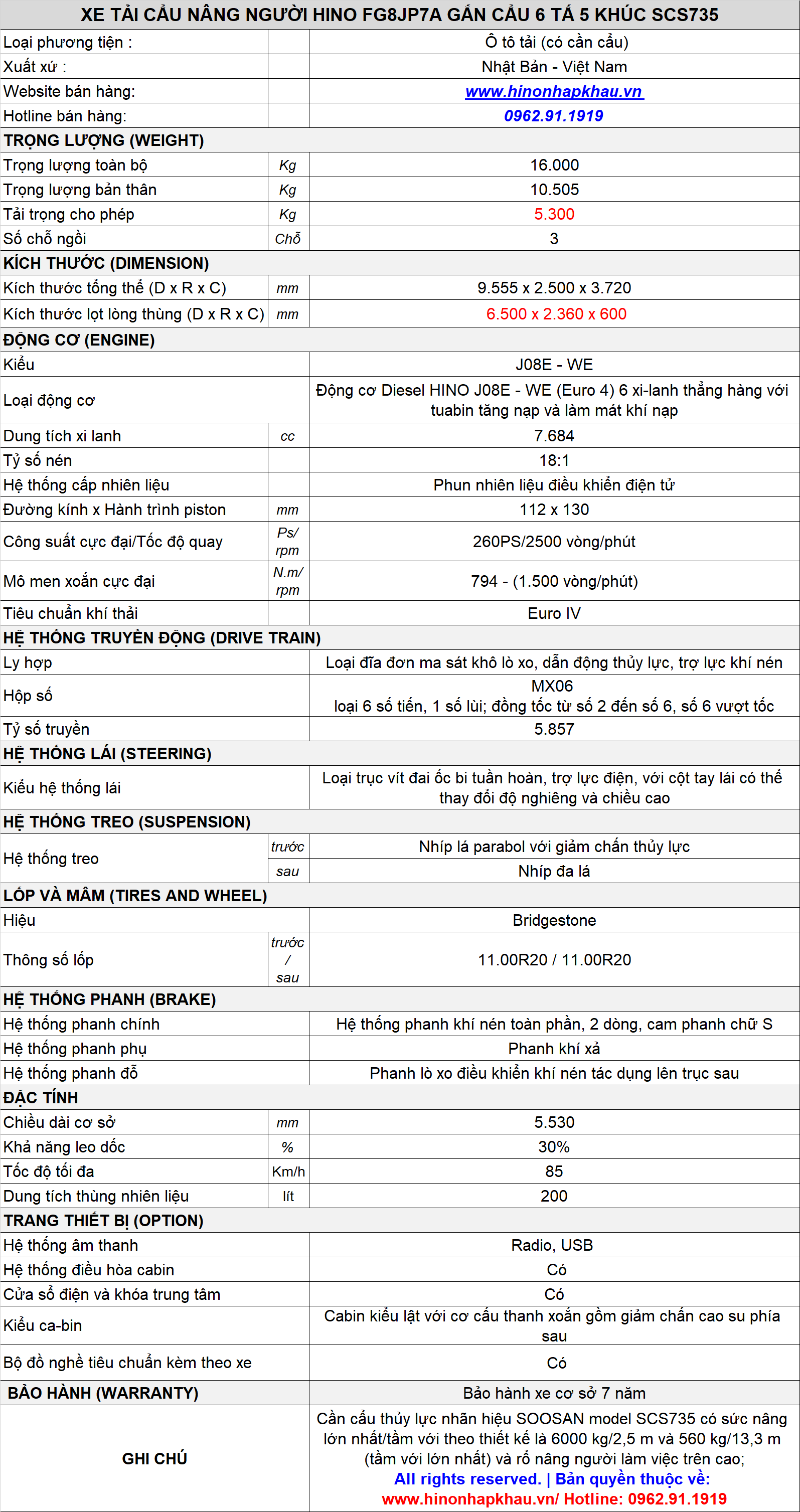 * THÔNG SỐ ĐẶC TÍNH KỸ THUẬT XE CẨU NÂNG NGƯỜI 6 TẤN HINO FG8JP7A GẮN CẨU 6 TẤN 5 ĐỐT SCS735 LÀM VIỆC TRÊN CAO 16M: