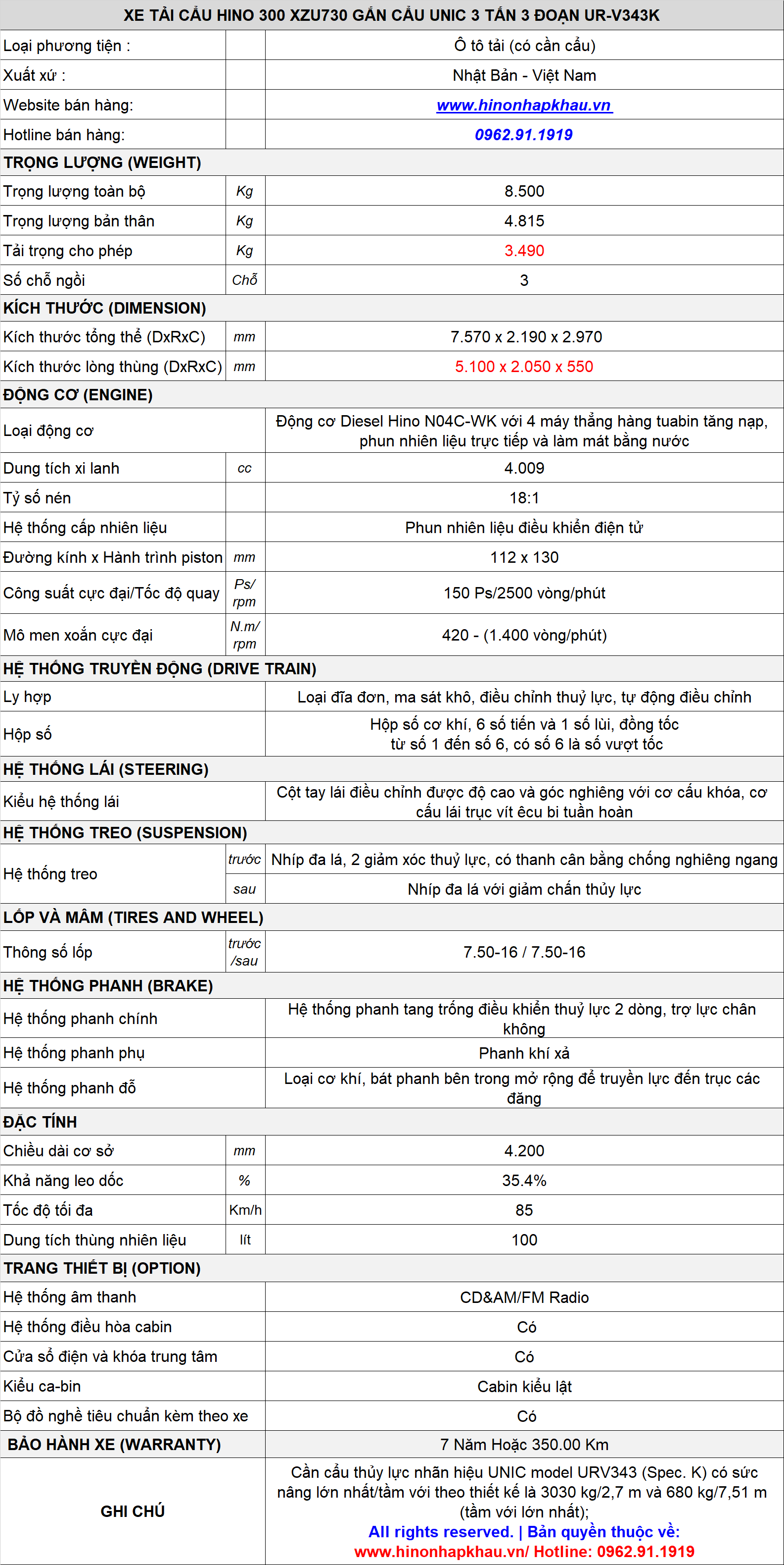 * ĐẶC TÍNH KỸ THUẬT XE CẨU UNIC 3 TẤN 3 ĐOẠN UR-V343K LẮP TRÊN HINO 5 TẤN XZU730L: