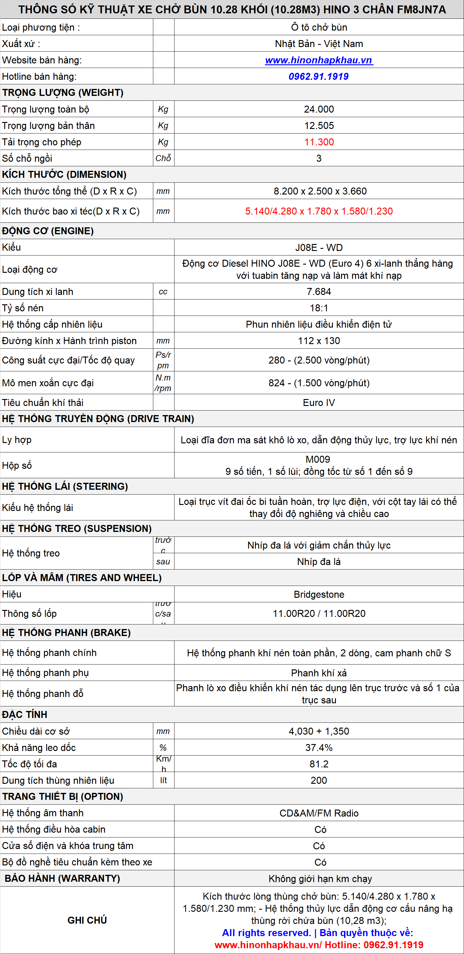 Với thương hiệu và chất lượng đã được khẳng định trên thị trường Việt Nam cũng như trên toàn thế giới, cùng với dịch vụ chăm sóc hậu mãi sau bán hàng, dịch vụ bảo dưỡng, chăm sóc uy tín chất lượng cao. Ô TÔ CHỞ BÙN 10.28 KHỐI FM8JN7A E.4 luôn luôn là " Sự lựa chọn hoàn hảo " cho tất cả mọi Khách hàng.