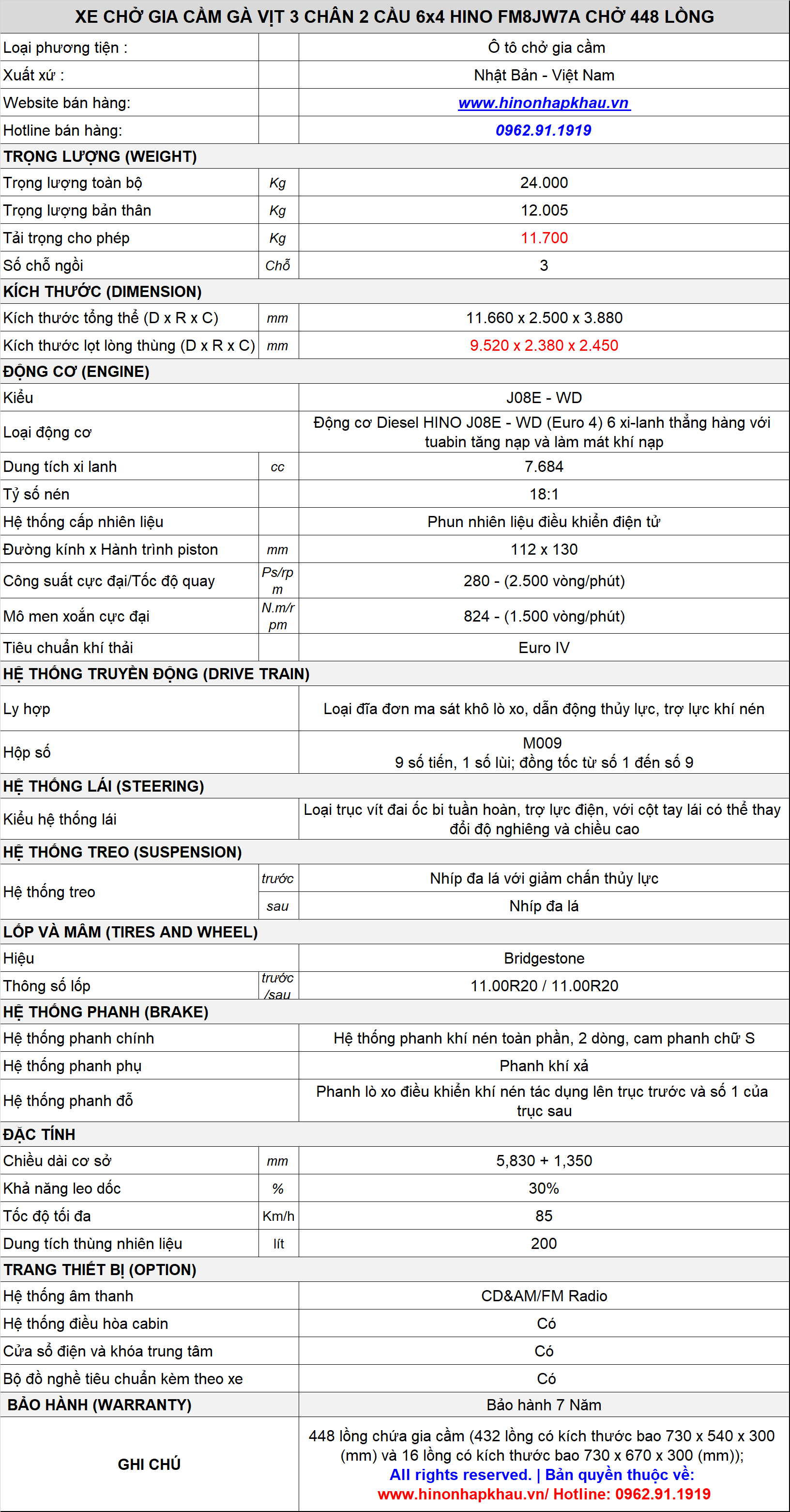 * THÔNG SỐ KỸ THUẬT XE CHỞ GÀ VỊT 3 CHÂN 2 CẦU THẬT EURO 5 HINO FM8JW7A ĐỜI 2025 - 2026: