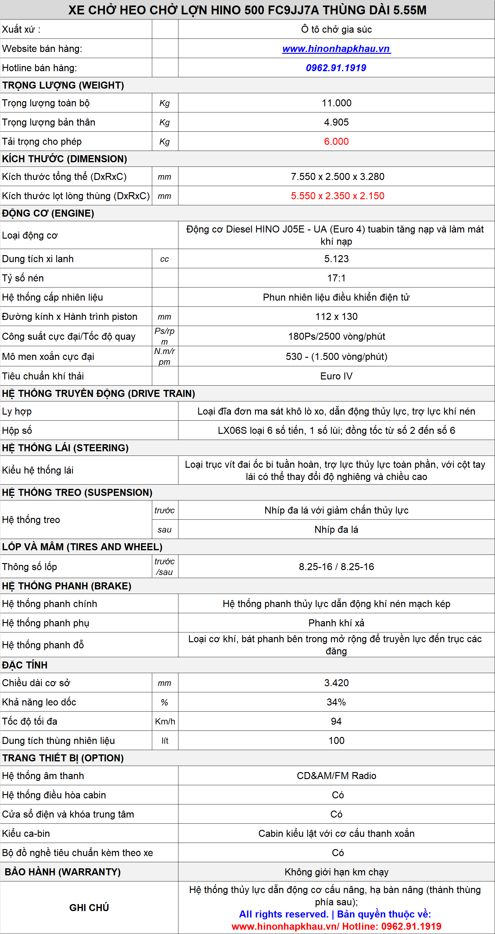 * THÔNG SỐ KỸ THUẬT XE CHỞ HEO CHỞ LỢN 6 TẤN HINO 500 FC9JJ7A EURO 5 MỚI NHẤT: