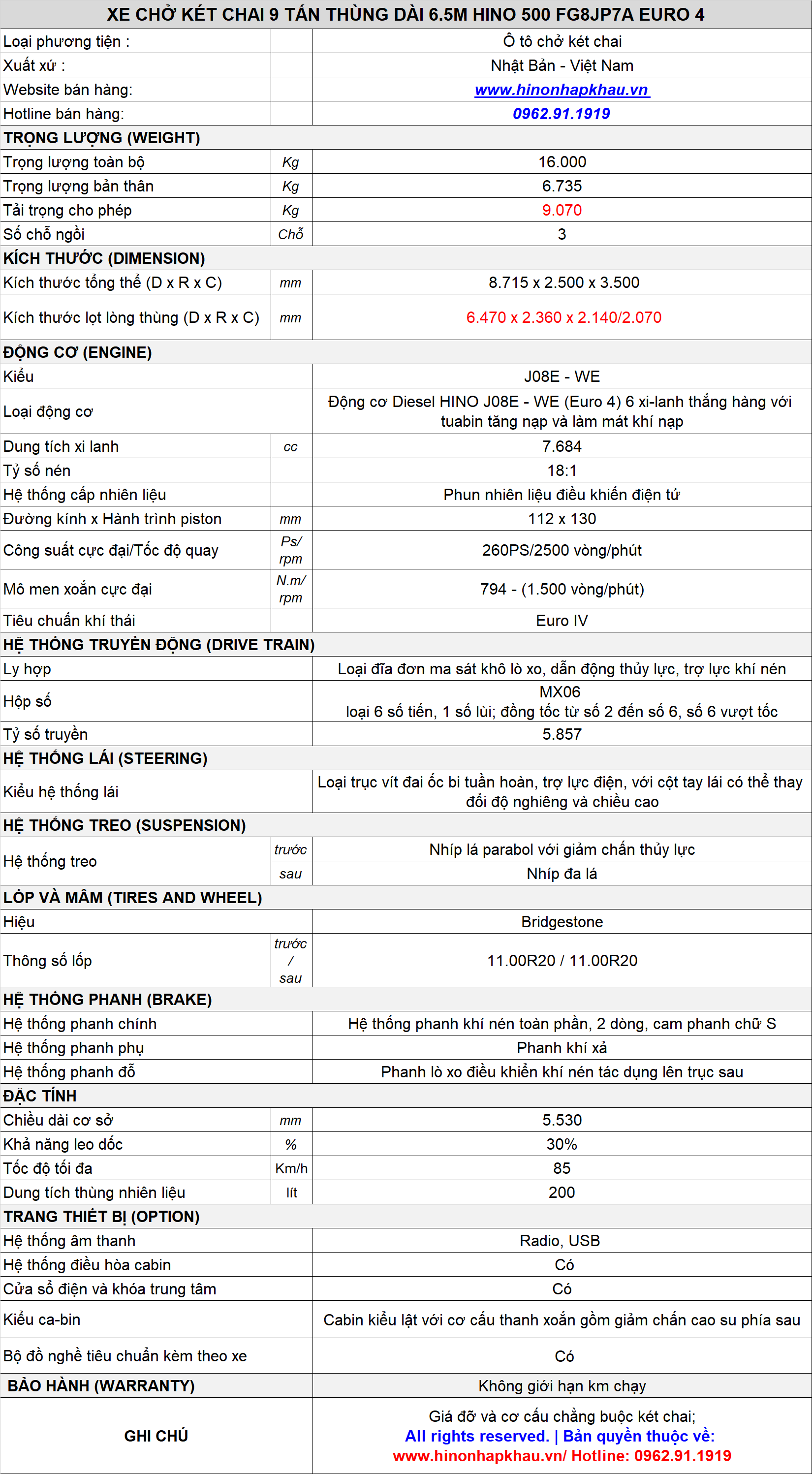 * THÔNG SỐ KỸ THUẬT XE CHỞ KÉT CHAI BIA 9 TẤN HINO 500 FG8JP7A EURO 4 ĐỜI NĂM 2020 - 2021 :