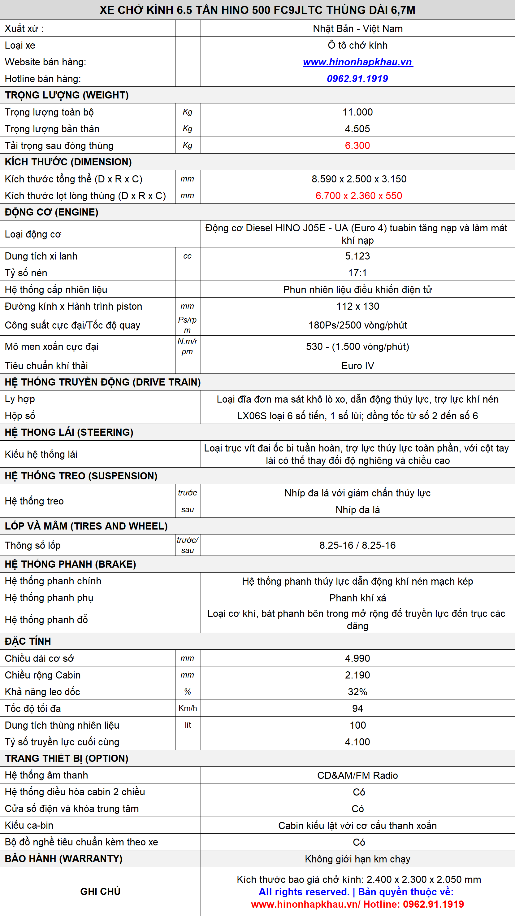 Với thương hiệu và chất lượng đã được khẳng định trên thị trường Việt Nam cũng như trên toàn thế giới, cùng với dịch vụ chăm sóc hậu mãi sau bán hàng, dịch vụ bảo dưỡng, chăm sóc uy tín chất lượng cao. ''HINO 6T5 CHỞ KÍNH'' luôn luôn là " Sự lựa chọn hoàn hảo " cho tất cả mọi Khách hàng.