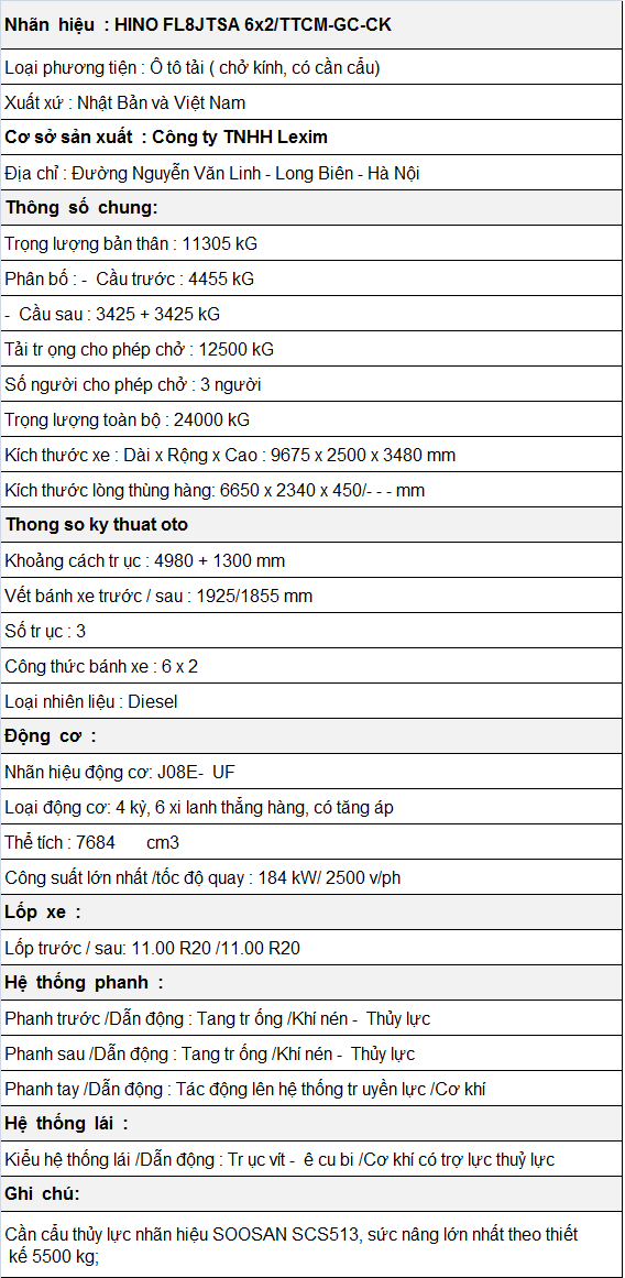 * Thông số kỹ thuật xe tải cẩu chở kính Hino 3 chân: