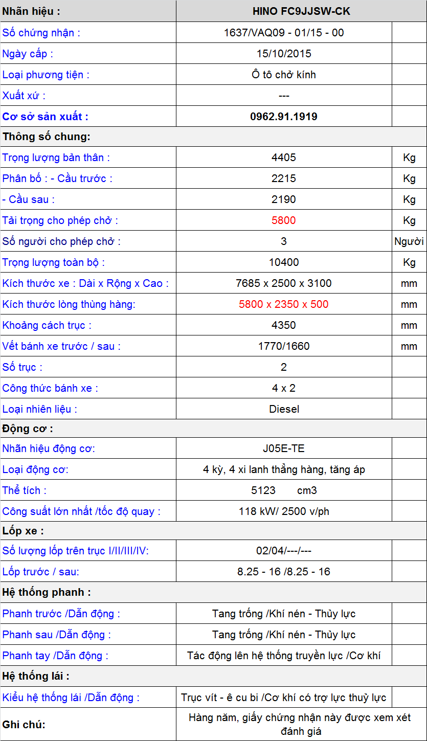 * Thông số kỹ thuật xe tải Hino FC9JJSW chở kính: